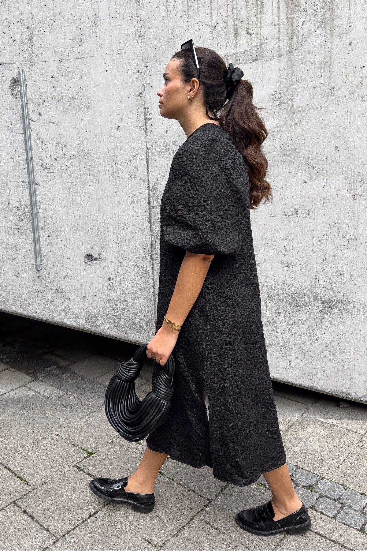 Zwarte lange jurk van Noella met bloemenpatroon textuur. De jurk heeft puffmouwen en een vetersluiting op de rug, evenals een V-halslijn en een mooie val tot halverwege de kuit.