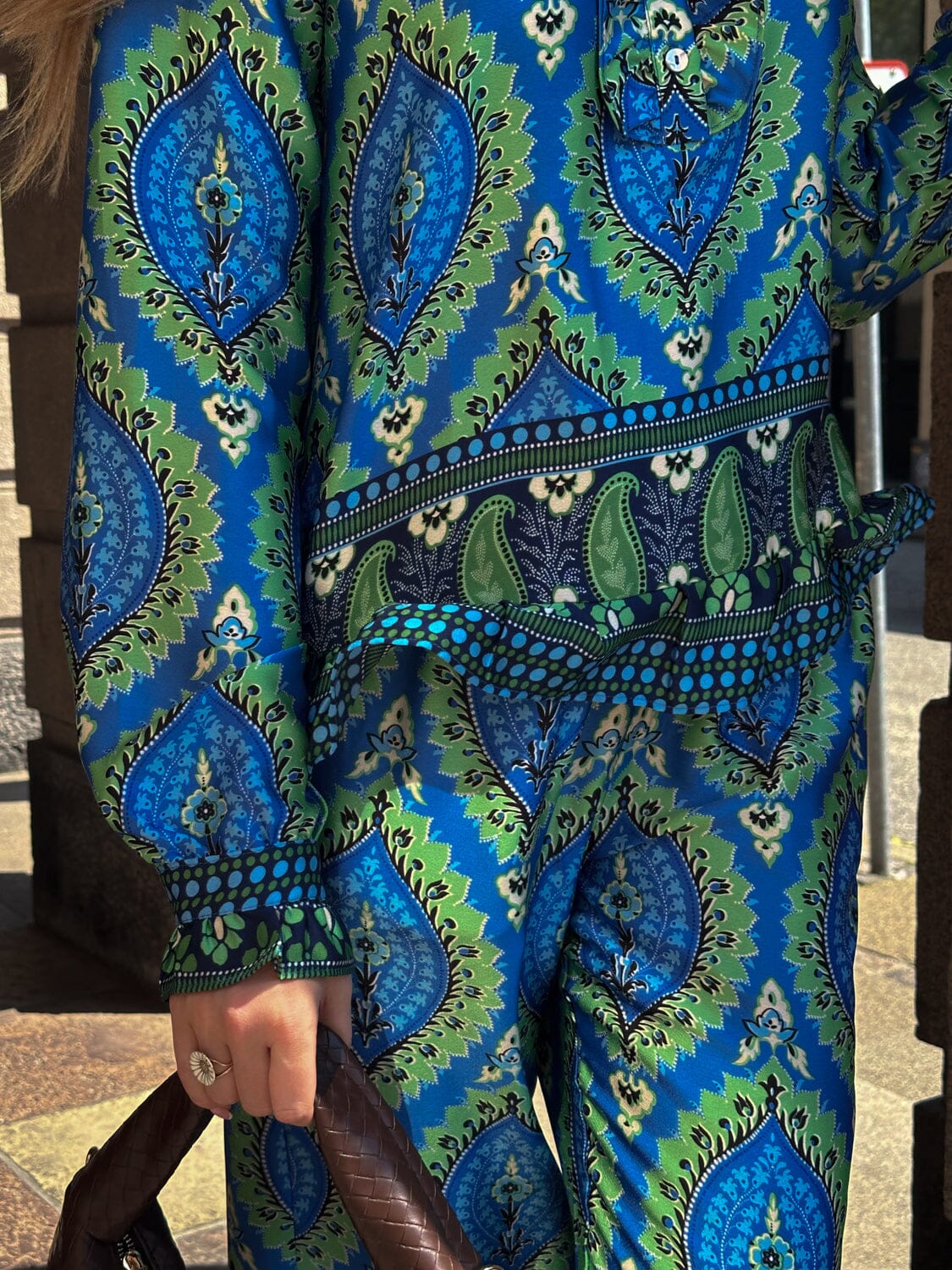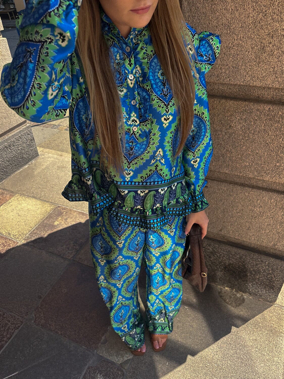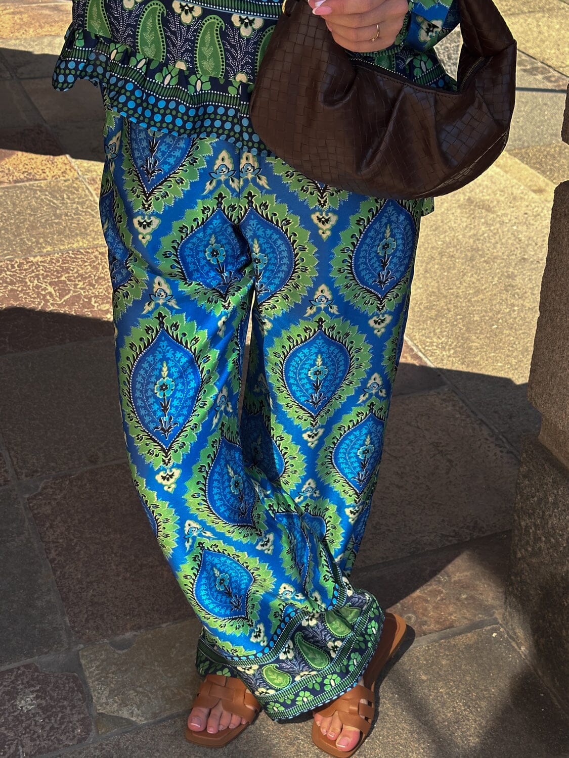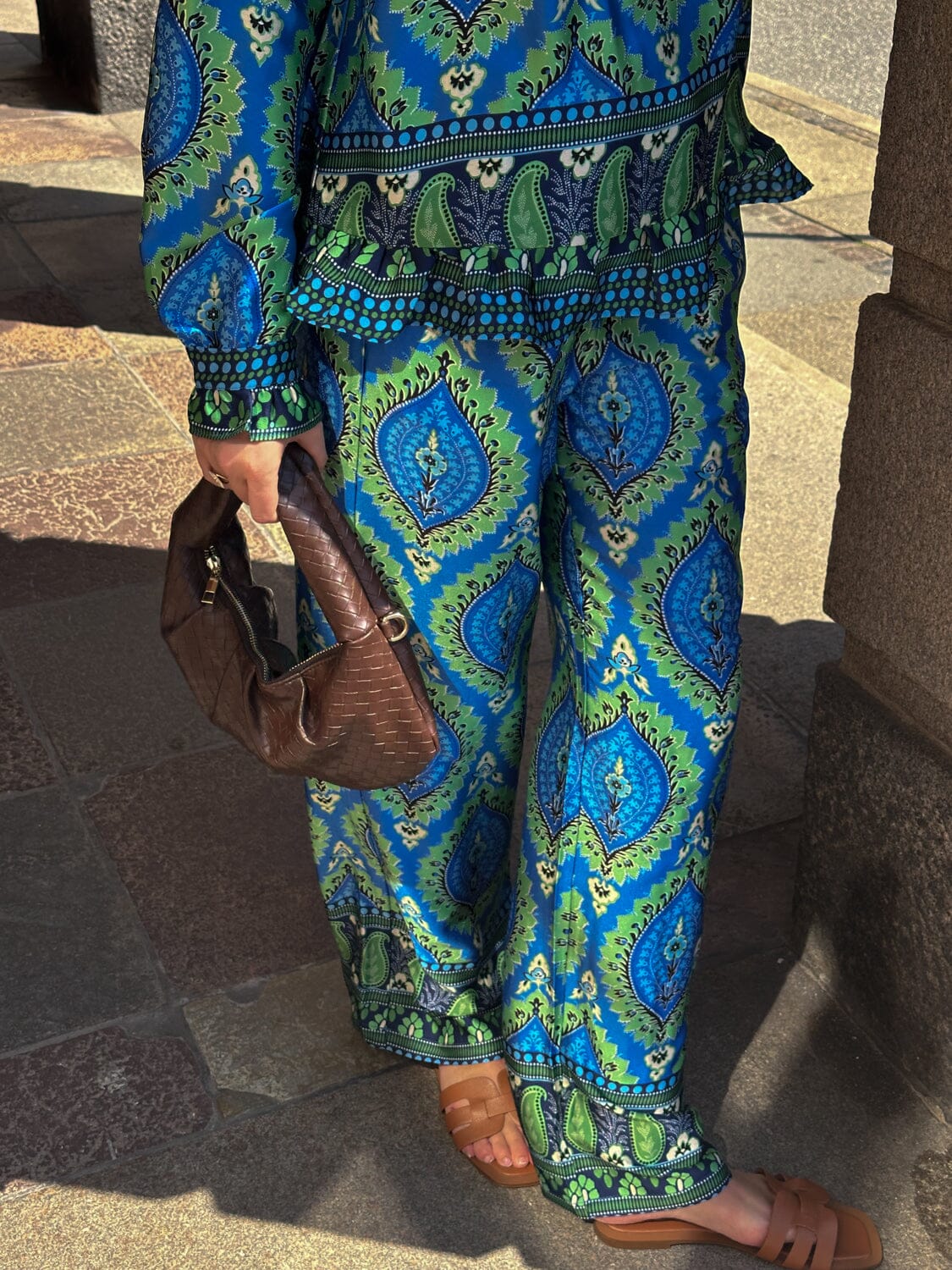 Broek van Noella met een blauwgroen paisleymotief. De broek heeft een decoratieve rand onderaan en een strikband in de taille waarmee de breedte kan worden aangepast.
