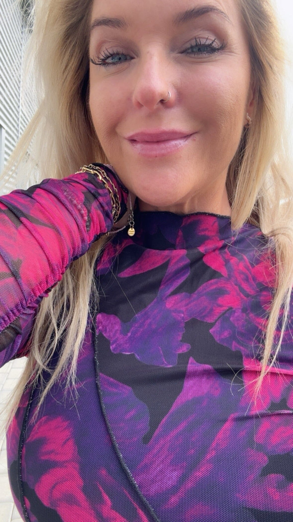 Midi-jurk van Noella met hoge hals en lange mouwen. De jurk heeft een bloemenpatroon in roze en paarse tinten op een zwarte achtergrond. Het gerimpelde detail en de aansluitende silhouet zorgen voor een goede pasvorm.