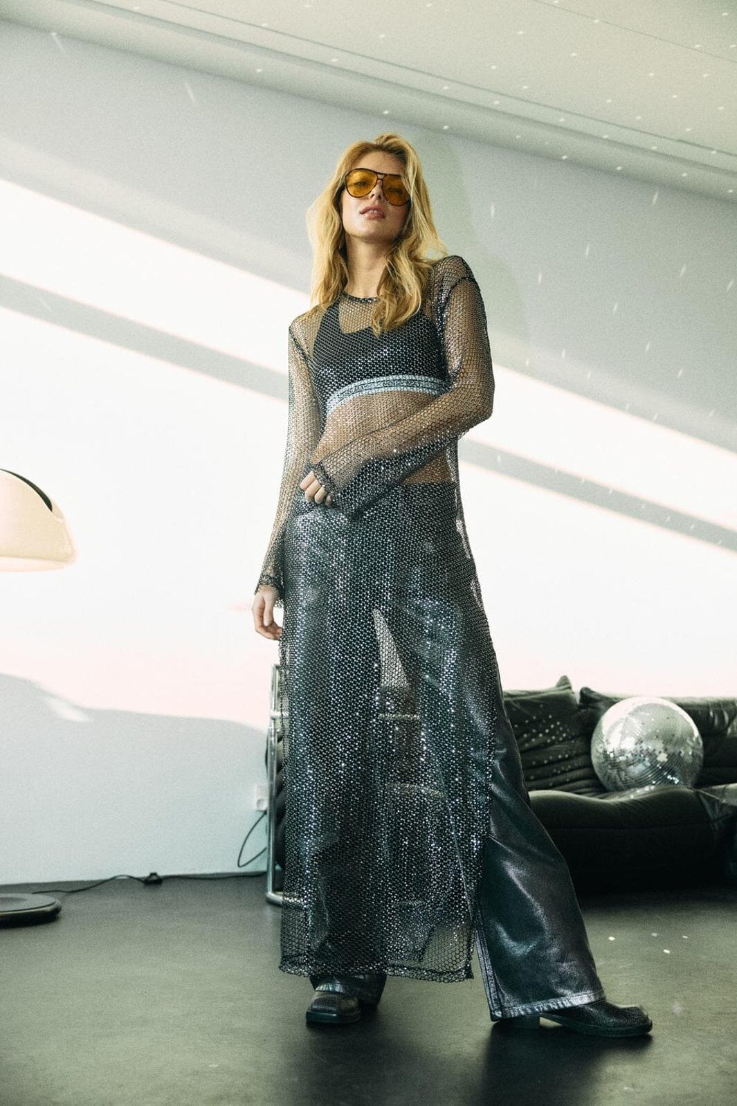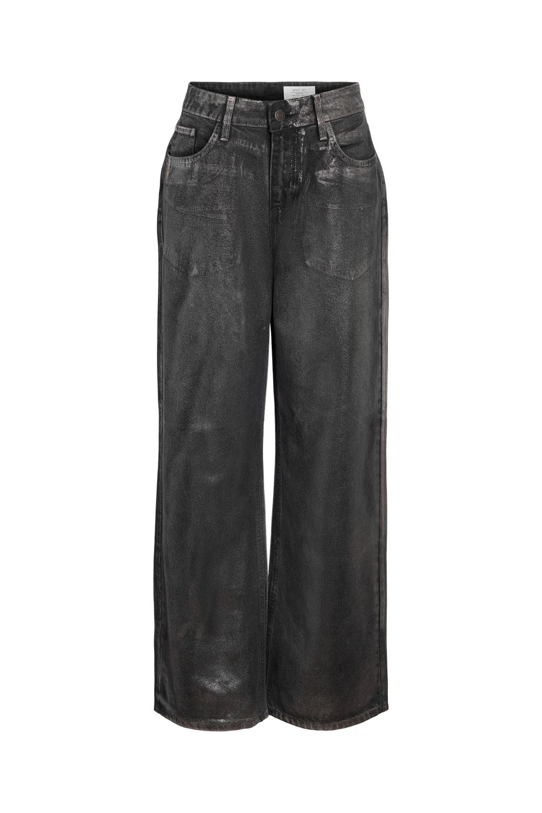 Jeans van Noisy May in middenblauwe denim met een zilveren coating. Het glanzende oppervlak combineert de acid wash-effect met een metallic glans, wat de broek zijn unieke karakter geeft.