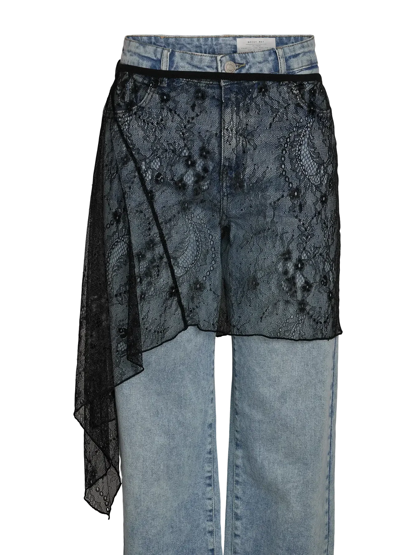 Zwarte kanten rok van Noisy May, ontworpen om over jeans of broeken te dragen. De rok heeft een bloemig kantpatroon en een asymmetrische zoom.