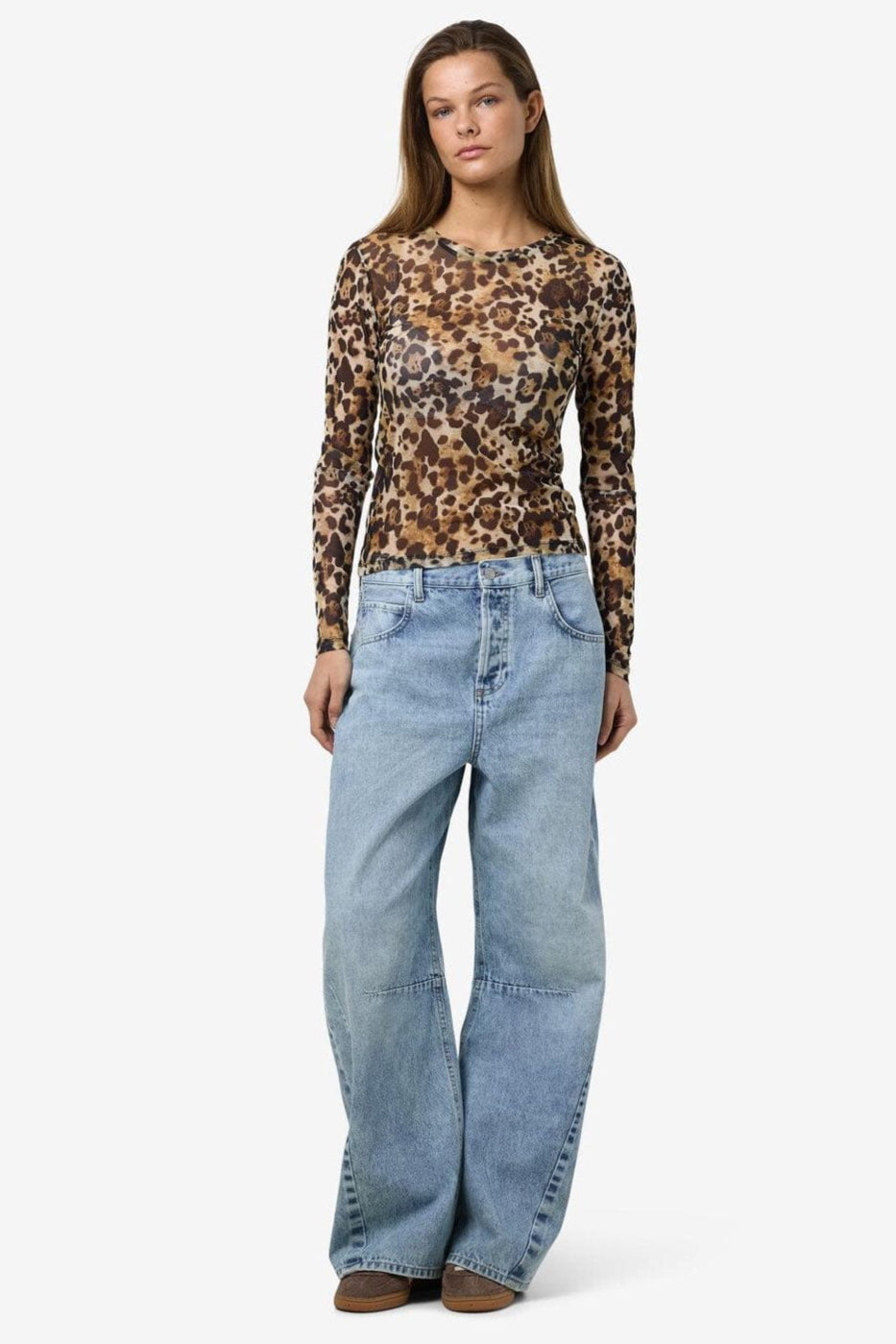 Langarmige mesh-top van Noisy May met luipaardprint in bruine en zwarte tinten. De top heeft een ronde halslijn en een polyester voering, waardoor hij doorschijnend is.
