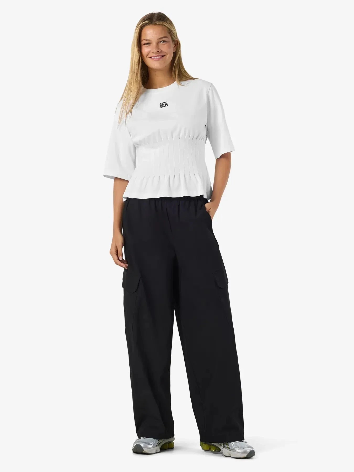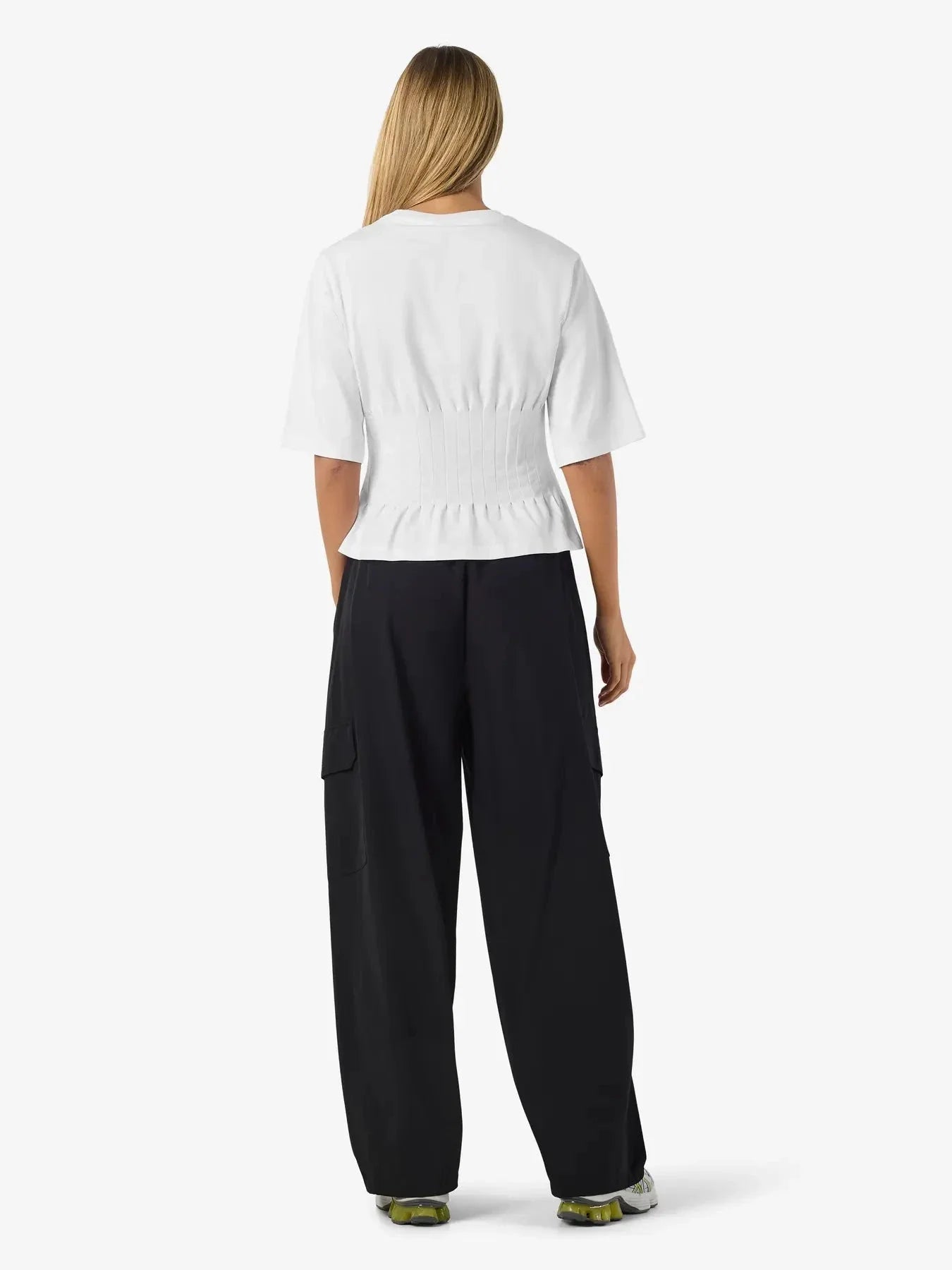 Witte fitted T-shirt van Noisy May met logo op de borst. Het T-shirt heeft een taille-naad met ruches.