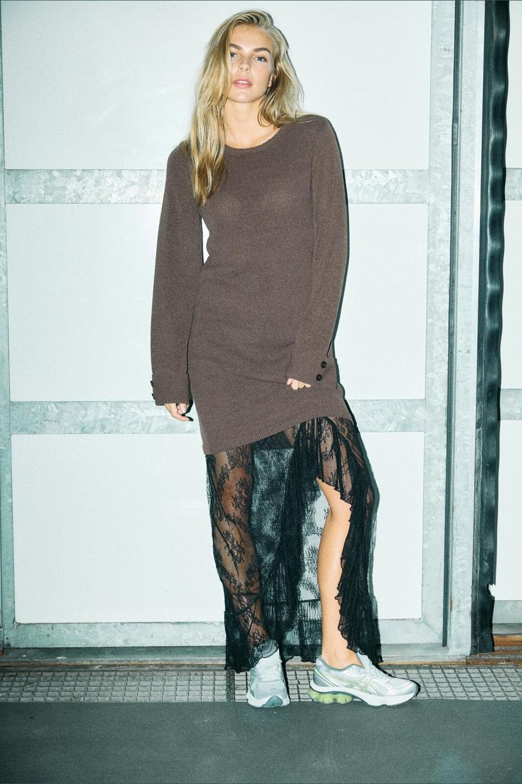 Zwarte lange rok van Noisy May met een doorschijnend kanten oppervlak en bloemenpatroon. De rok heeft asymmetrische ruches en een elastische taille zonder sluiting.