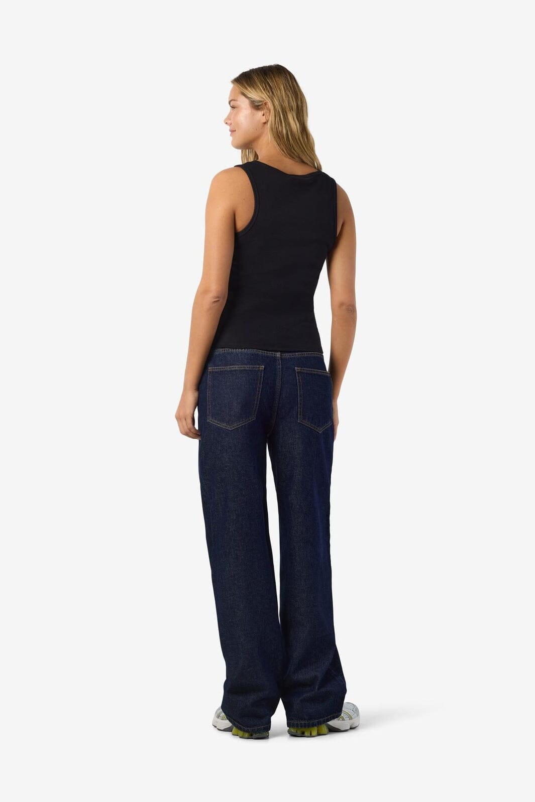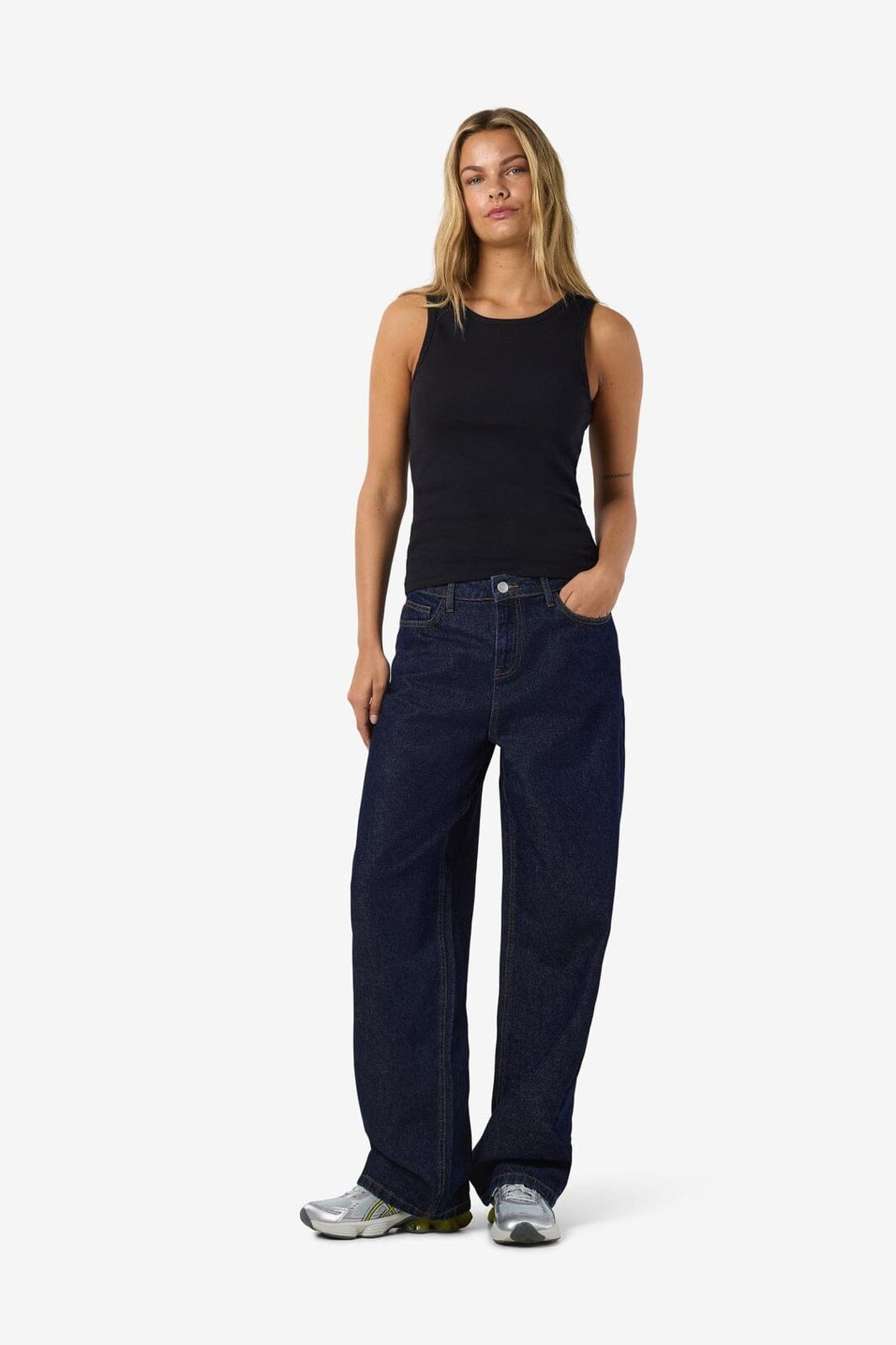 Zwarte tanktop van Noisy May met ronde halslijn en brede schouderbanden. De aansluitende pasvorm benadrukt de lijnen van het lichaam.