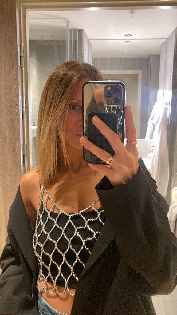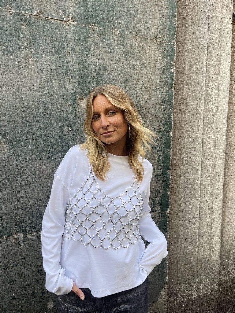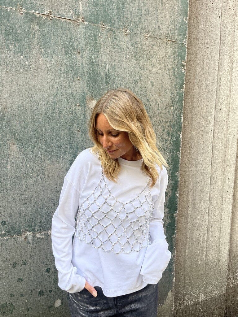 Zilverkleurige kralentop van Noisy May met een netachtig patroon van aaneengeschakelde kralen. De top heeft dunne spaghettibandjes en een V-hals.