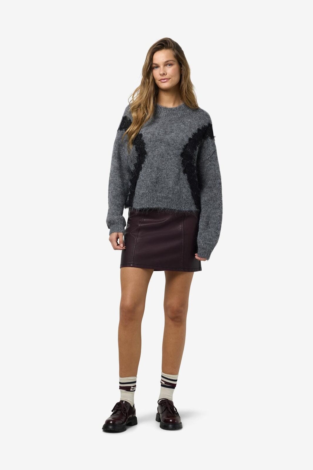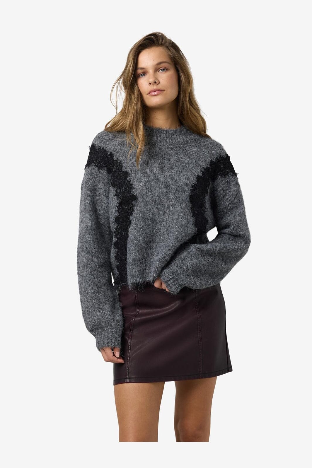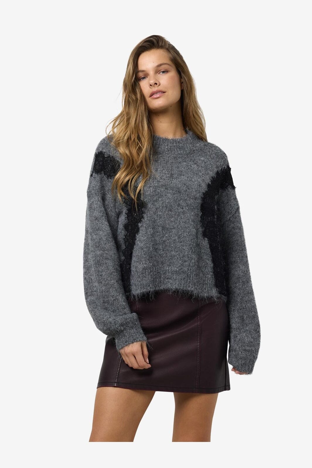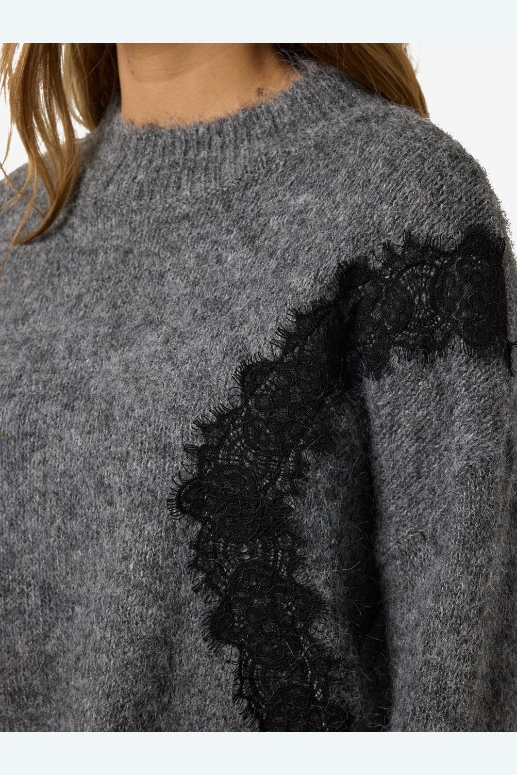 Noisy May Nmsutton L/S O-Neck Lace Knit Fwd Kleur: 4986587 Dark Grey Melange Lace