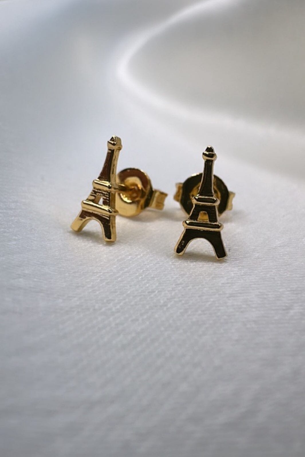 Vergulde oorstekers van O element in de vorm van de Eiffeltoren. De kleine oorbellen hebben een gedetailleerde vormgeving van de iconische toren in een gouden tint.