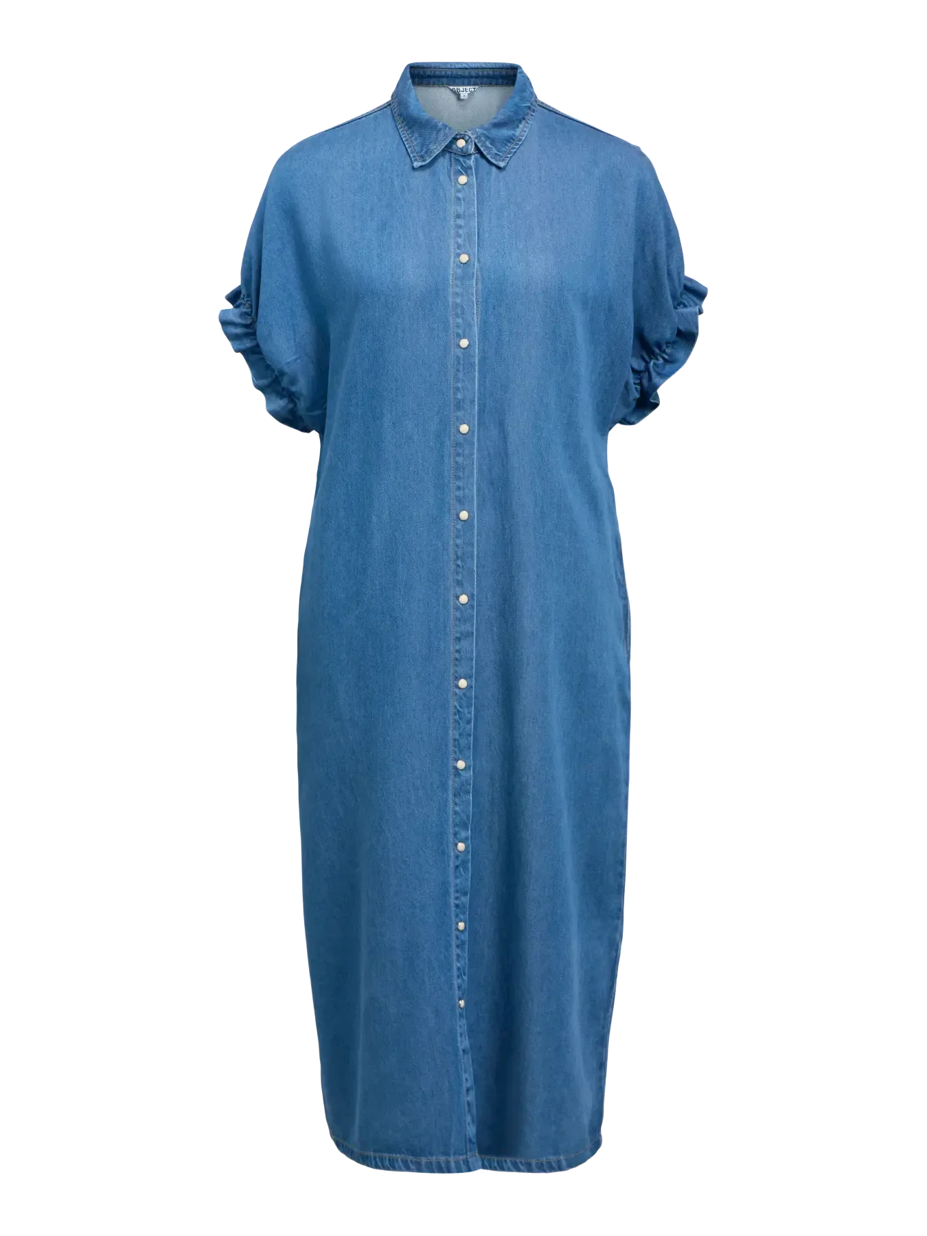 Denimjurk van Object in medium blauw. De jurk heeft een overhemdkraag, knopen helemaal naar beneden en korte mouwen met ruches. De losse pasvorm valt tot halverwege de kuit.