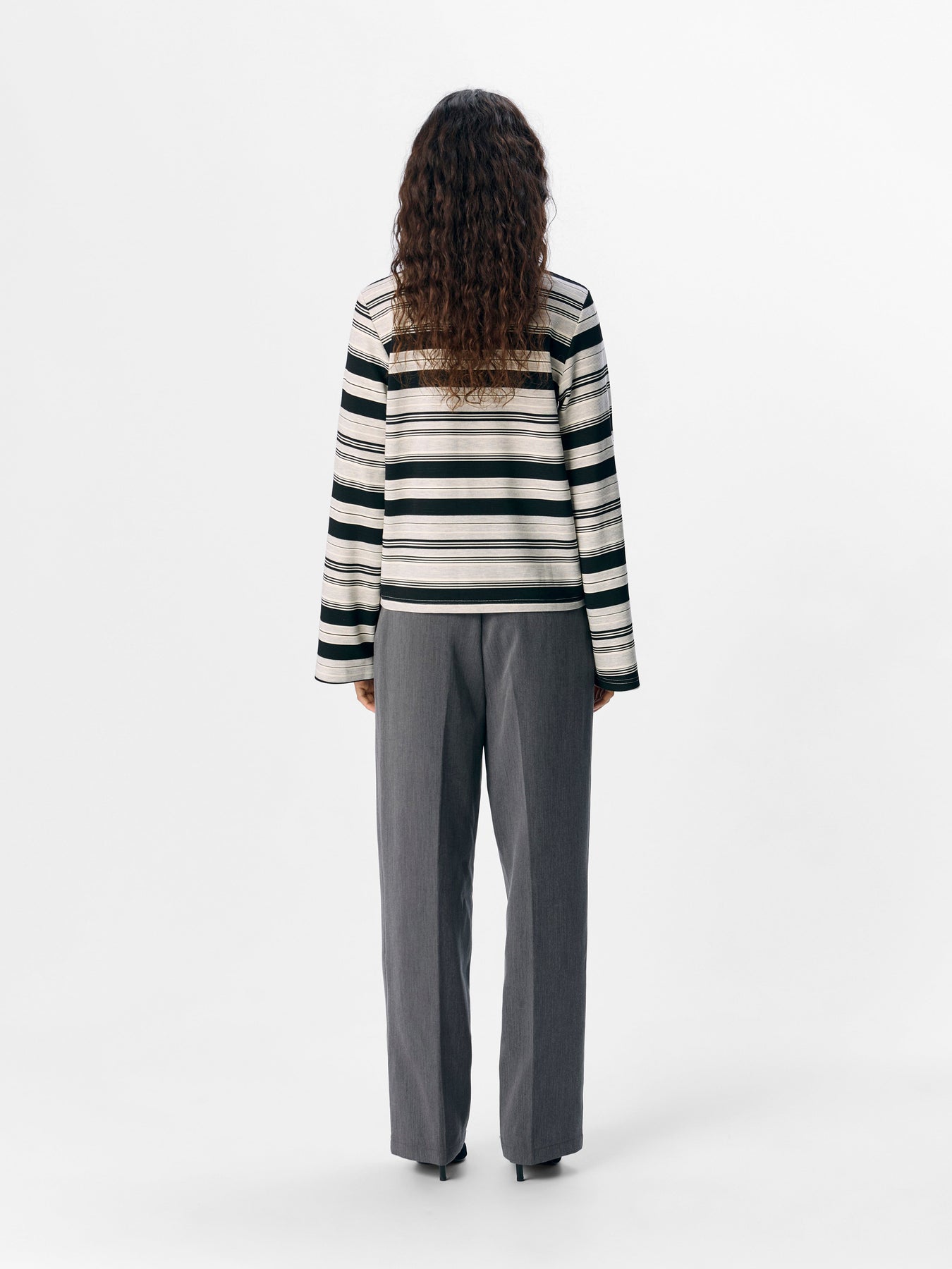 Lange mouw polo-top van Object met strepen in zwart, wit en beige. De top heeft een klassieke polokraag met knoopsluiting en een regular fit.