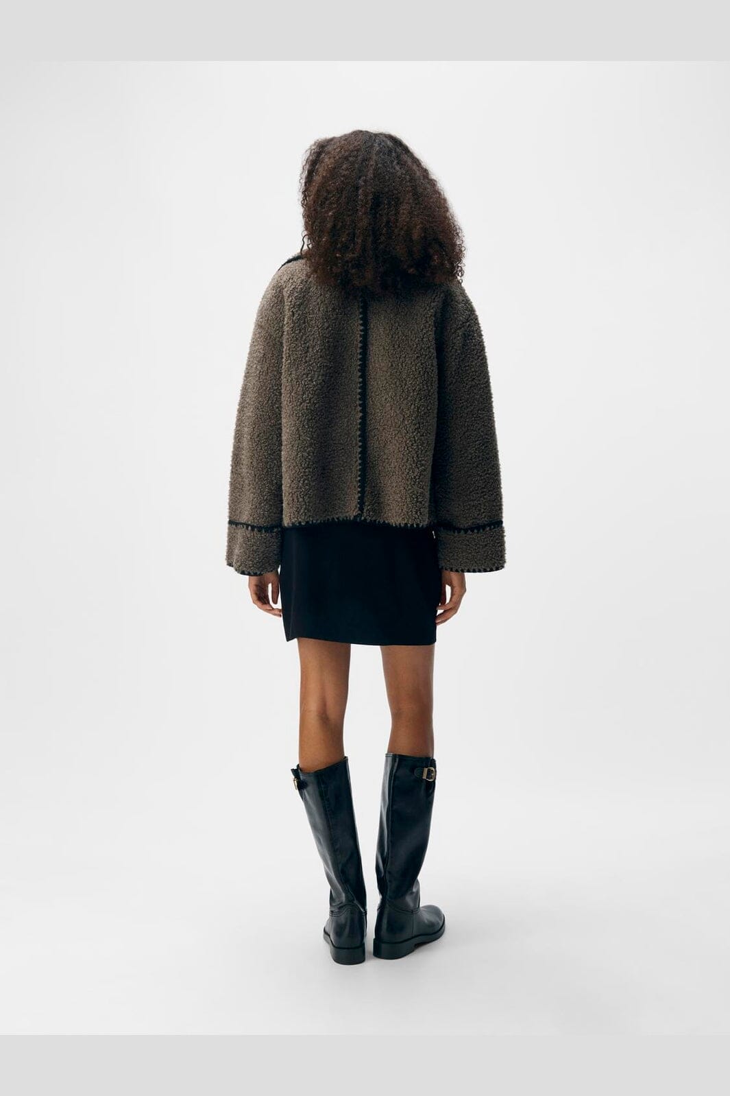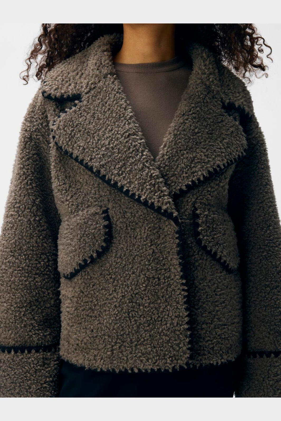 Bruine teddyjas van Object met een grote kraag en decoratieve stiksels. De jas heeft een pluizige textuur en lange mouwen met verlaagde schoudernaden.