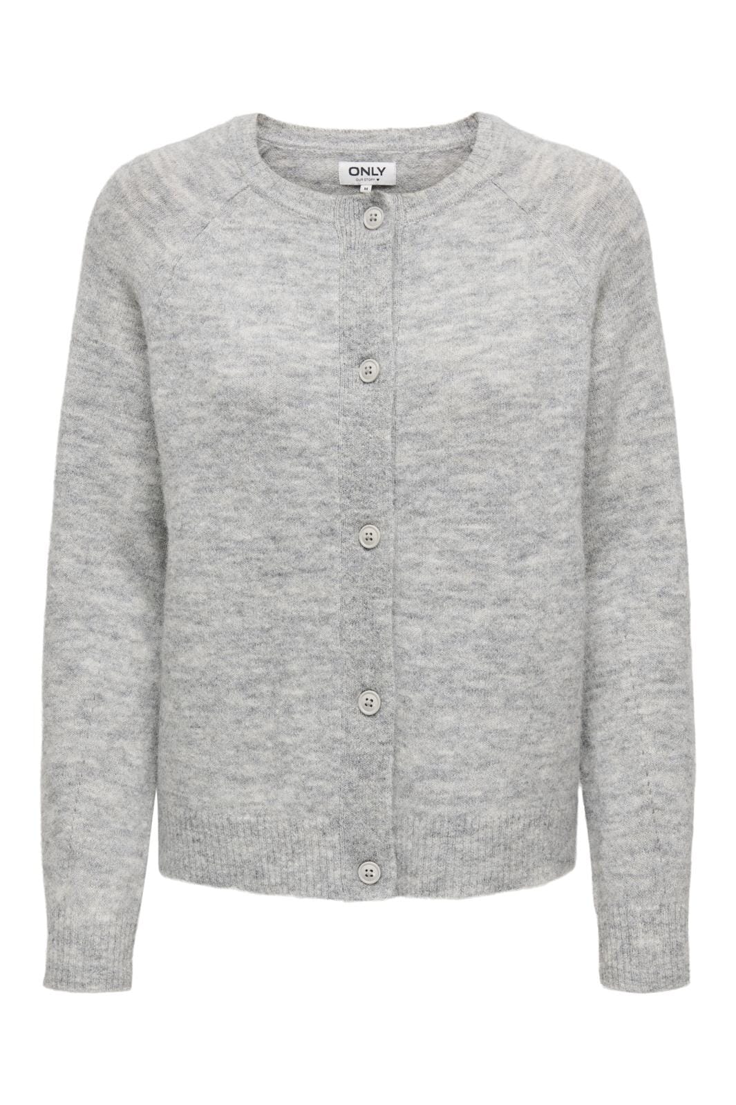 Lichtgrijze cardigan van Only met O-hals en lange mouwen. De gebreide cardigan heeft een zachte melange-effect en sluit met knopen aan de voorkant.