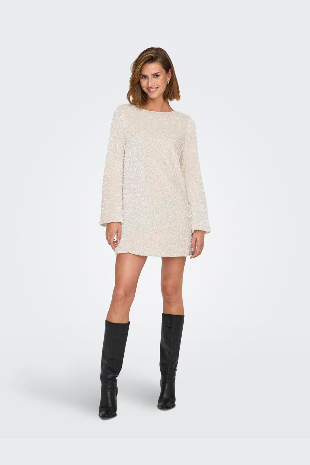 Paillettenjurk van Only in een lichte crèmekleur. De jurk heeft lange mouwen bedekt met pailletten en een zwarte strik aan de achterkant.