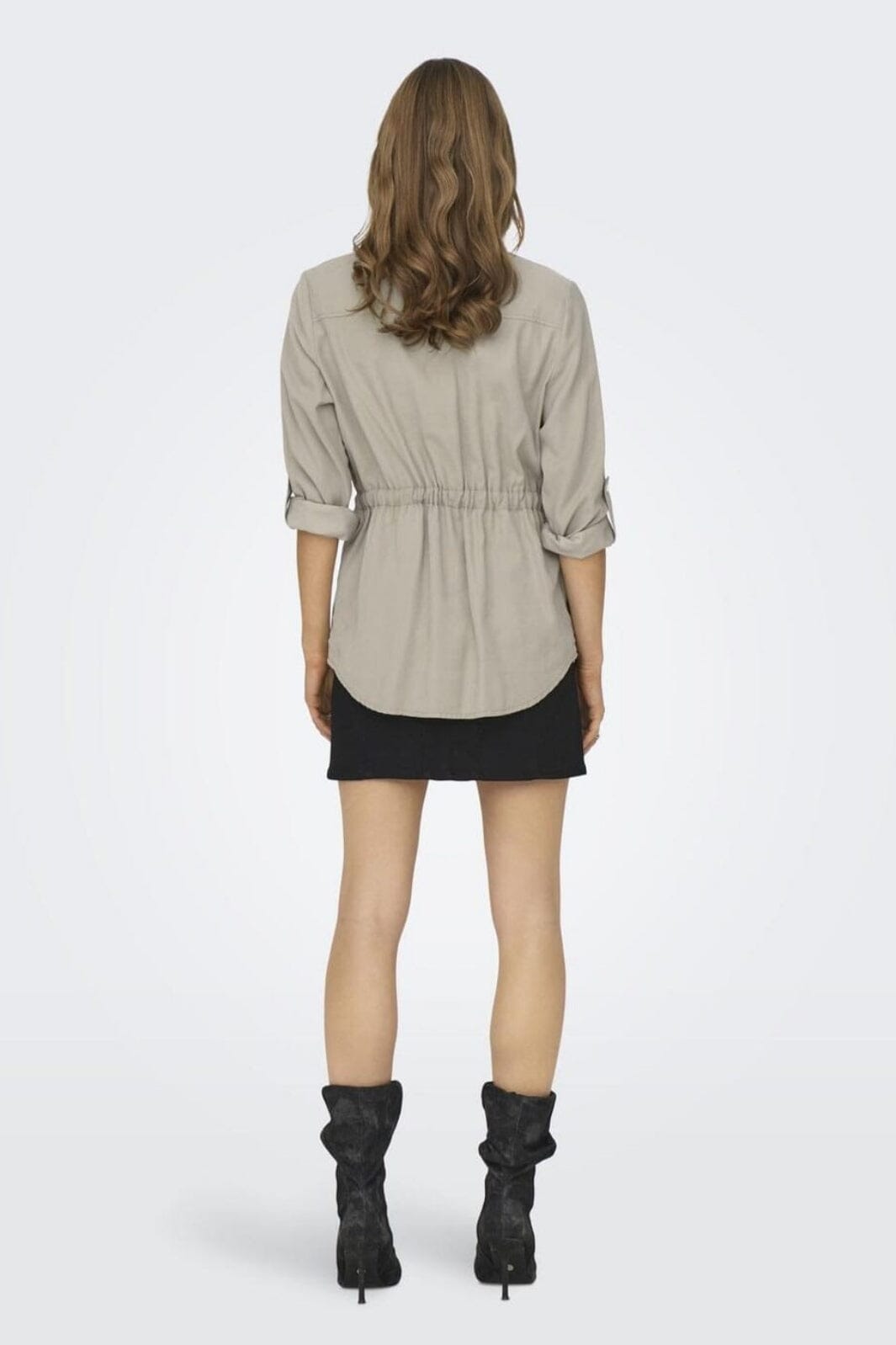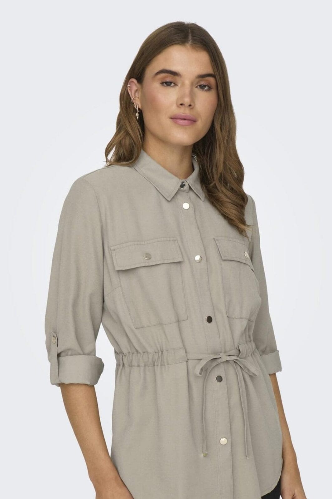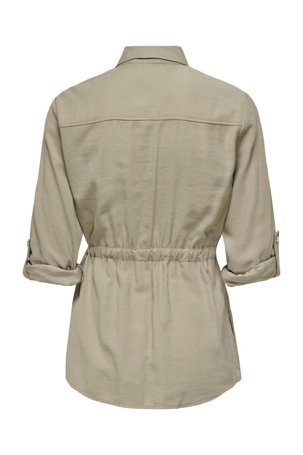 Beige cargojack van Only met gespreide overhemdkraag en 4/5 mouwen. De jas heeft borstzakken met knopen en een riem in de taille met een koord voor aanpassing.