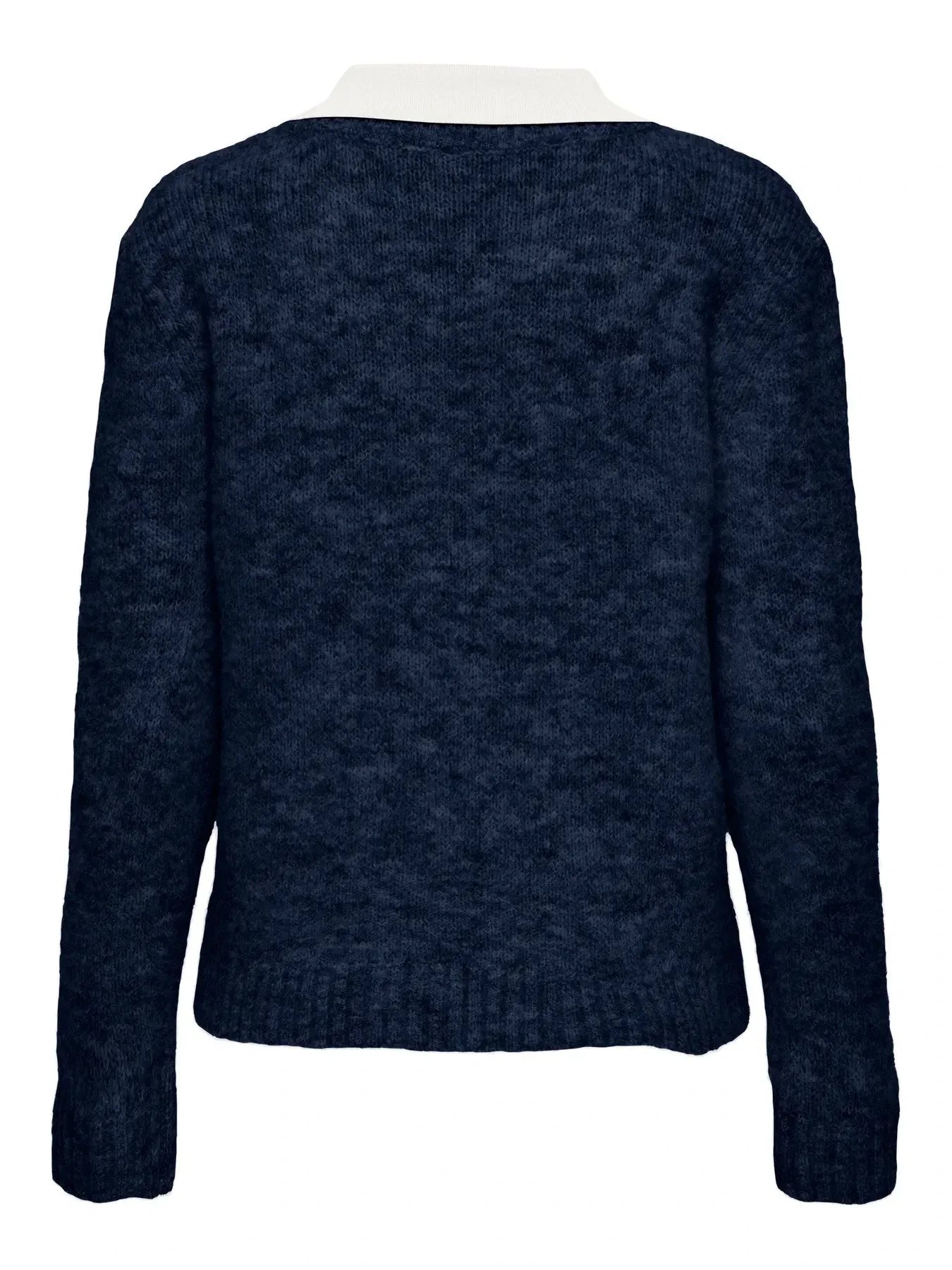 Donkerblauwe gemêleerde trui van Only met een contrasterende witte polokraag. De trui is een pullover in vlakbreisel met lange mouwen en een losse pasvorm.
