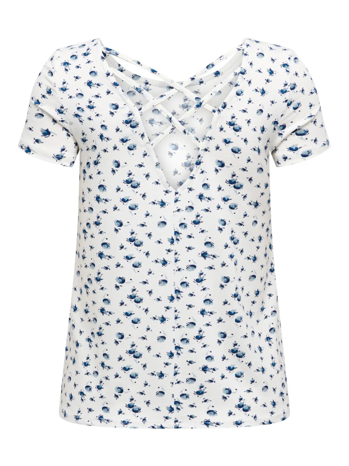Kort mouwentop van Only met een blauwe bloemenprint op een witte achtergrond. De top heeft een regular fit-pasvorm en gekruiste koorden op de rug.
