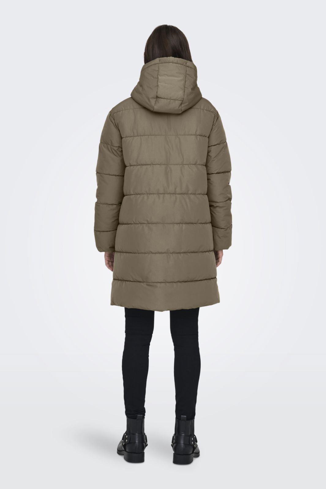 Steengrijze pufferjas van Only met warme synthetische vulling. De jas heeft een praktische capuchon met trekkoord en stormmanchetten die de kou buiten houden op koude dagen.