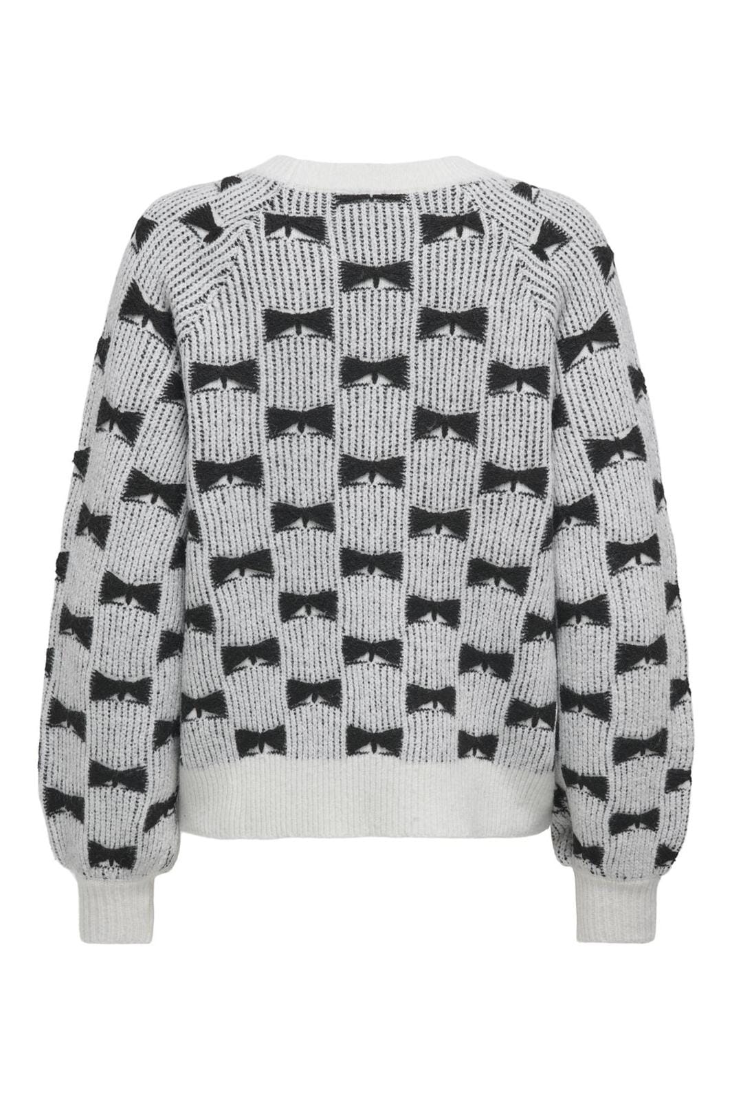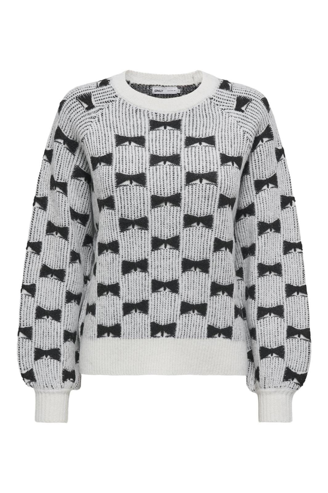 Gebreide trui van Only in het wit met zwarte strikken. Het heeft een ronde hals en lange ballonmouwen met ribgebreide manchetten. Het strikpatroon komt overal op de trui terug in een zwarte print op de lichte achtergrond.