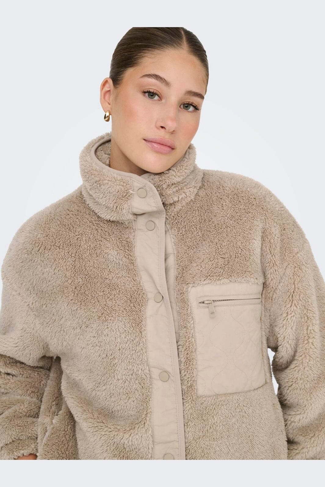 Beige jas van Only met een fluffy textuur en hoge kraag. Hij heeft een oversized pasvorm en is gemaakt van gerecycled polyester met een zachte oppervlakte en praktische details.