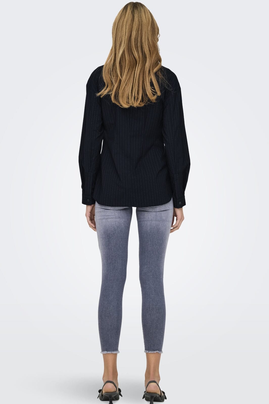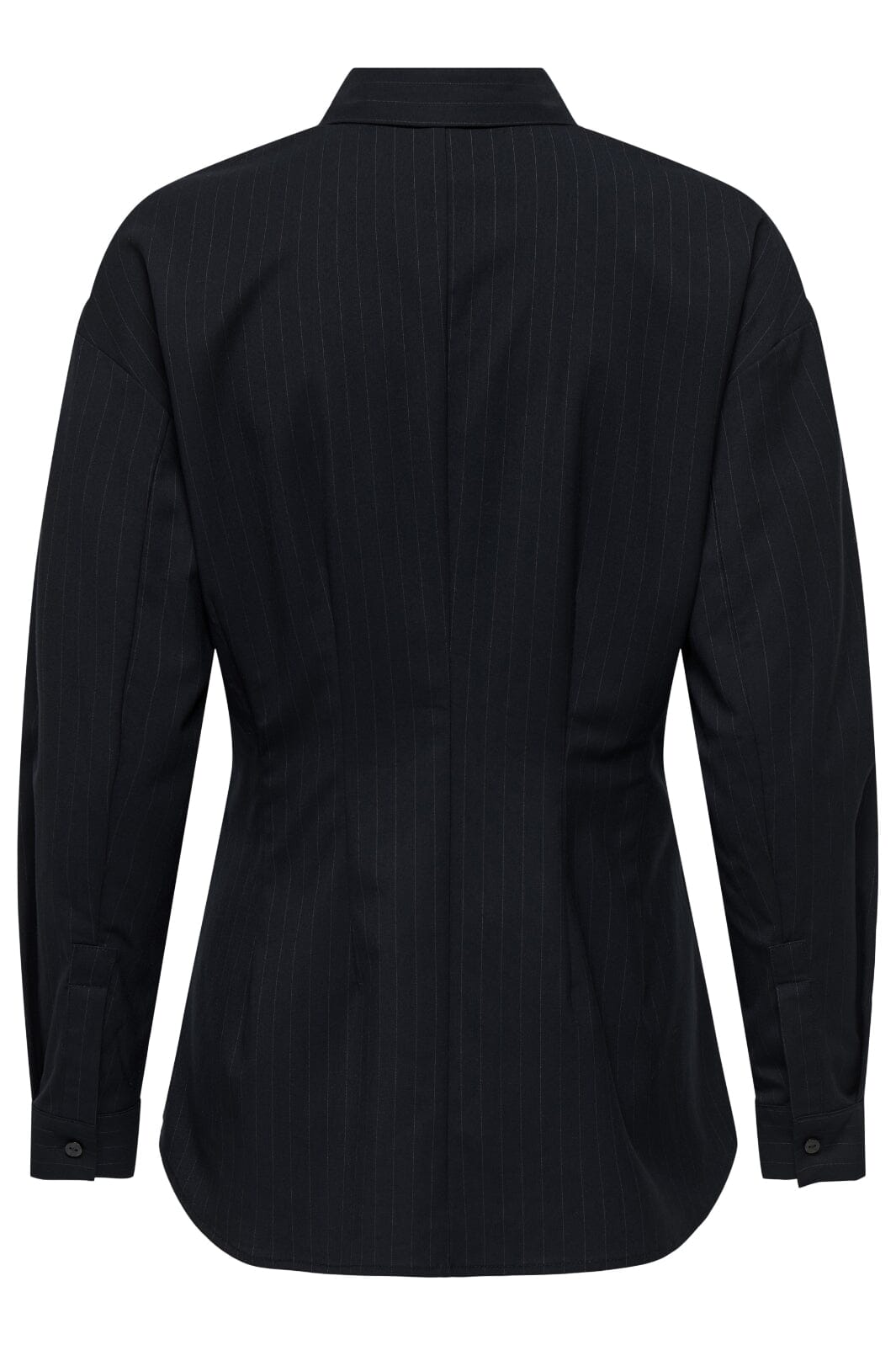 Zwarte blouse van Only met witte naaldstrepen. De blouse heeft een slim fit-pasvorm en een klassieke kraag. Het is geschikt voor zowel formele als casual gelegenheden.