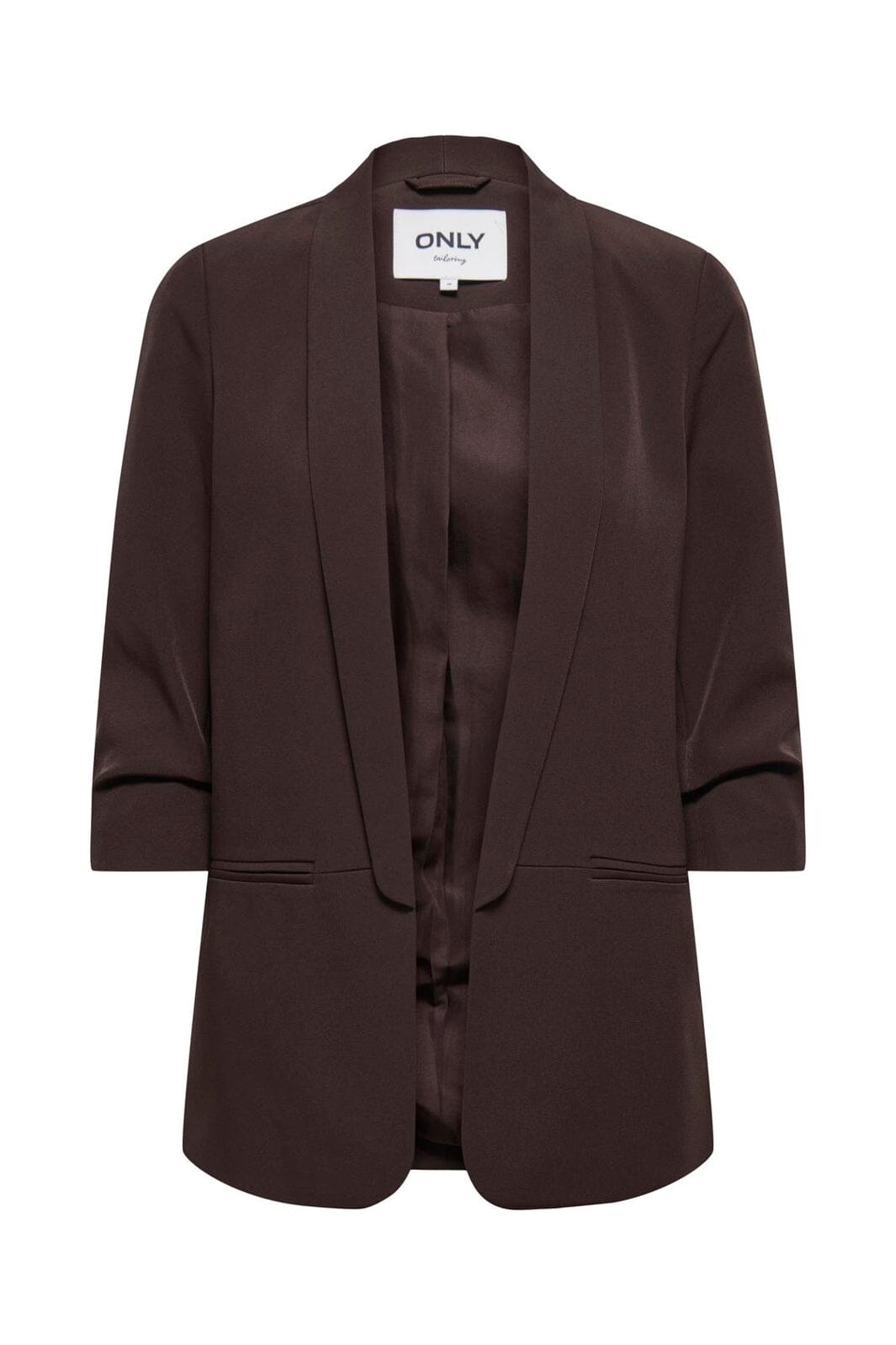 Bruine blazer van Only met driekwart mouwen en een reverskraag. De open voorkant zonder knopen en de twee voorzakken geven de blazer een strakke en eenvoudige uitstraling.