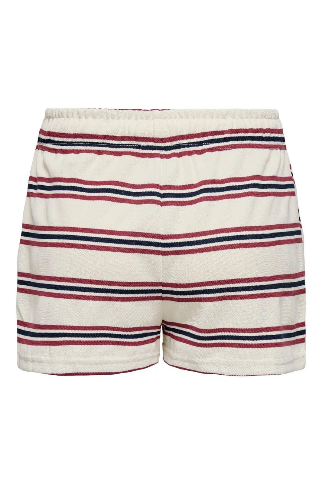 Gestreepte shorts van Only met een losse pasvorm. De shorts hebben een maritiem ontwerp in een witte basis met bordeaux en donkerblauwe strepen. Het losse model biedt veel bewegingsvrijheid.