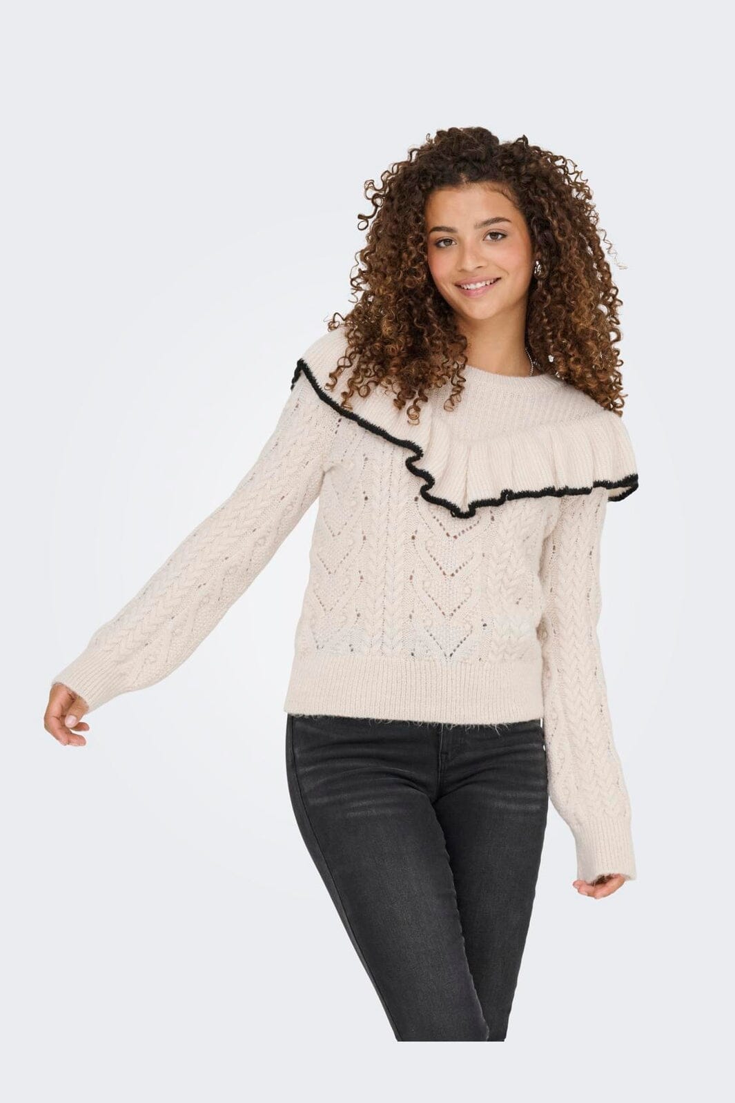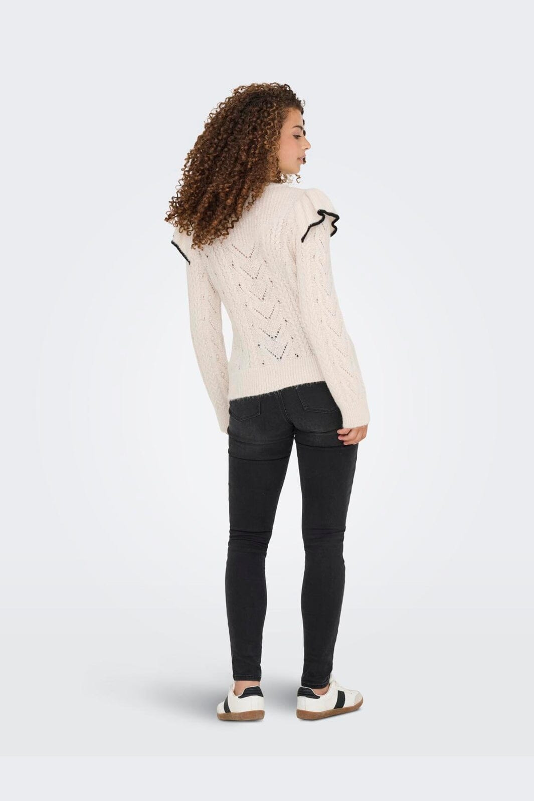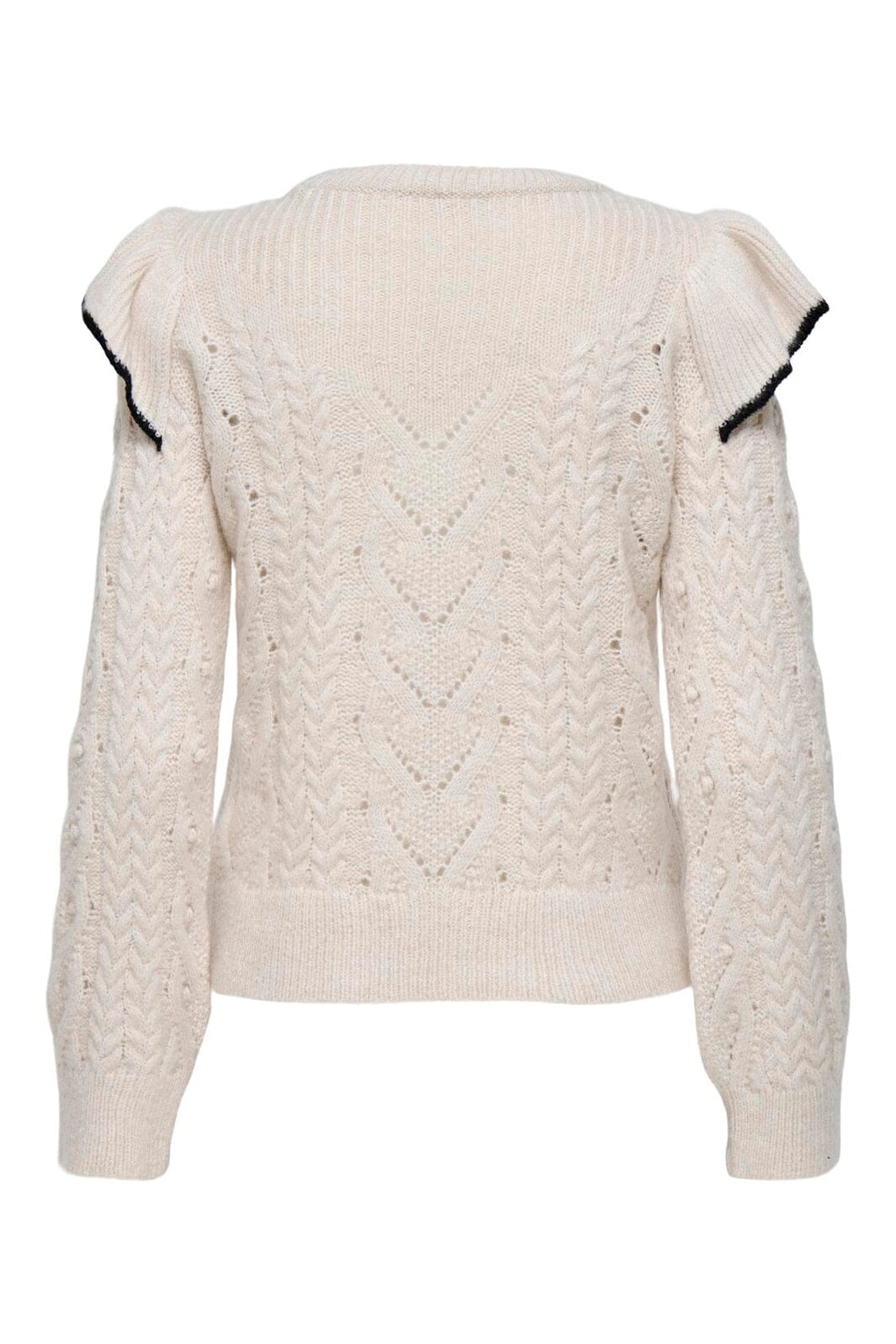 Trui van Only in een lichte berk-zwart tint. Hij heeft een ronde halslijn met ruches en een zwarte rand, lange mouwen en een kabelgebreid patroon over de hele trui.