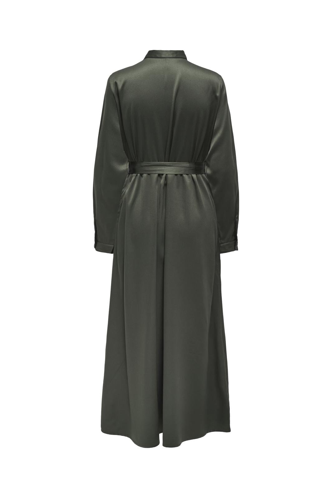 Shirtjurk van Only in donkergroene Kambaba-kleur. De jurk heeft lange mouwen en een overhemdkraag met knopen helemaal naar beneden. Een riem in de taille biedt de mogelijkheid om de pasvorm aan te passen.