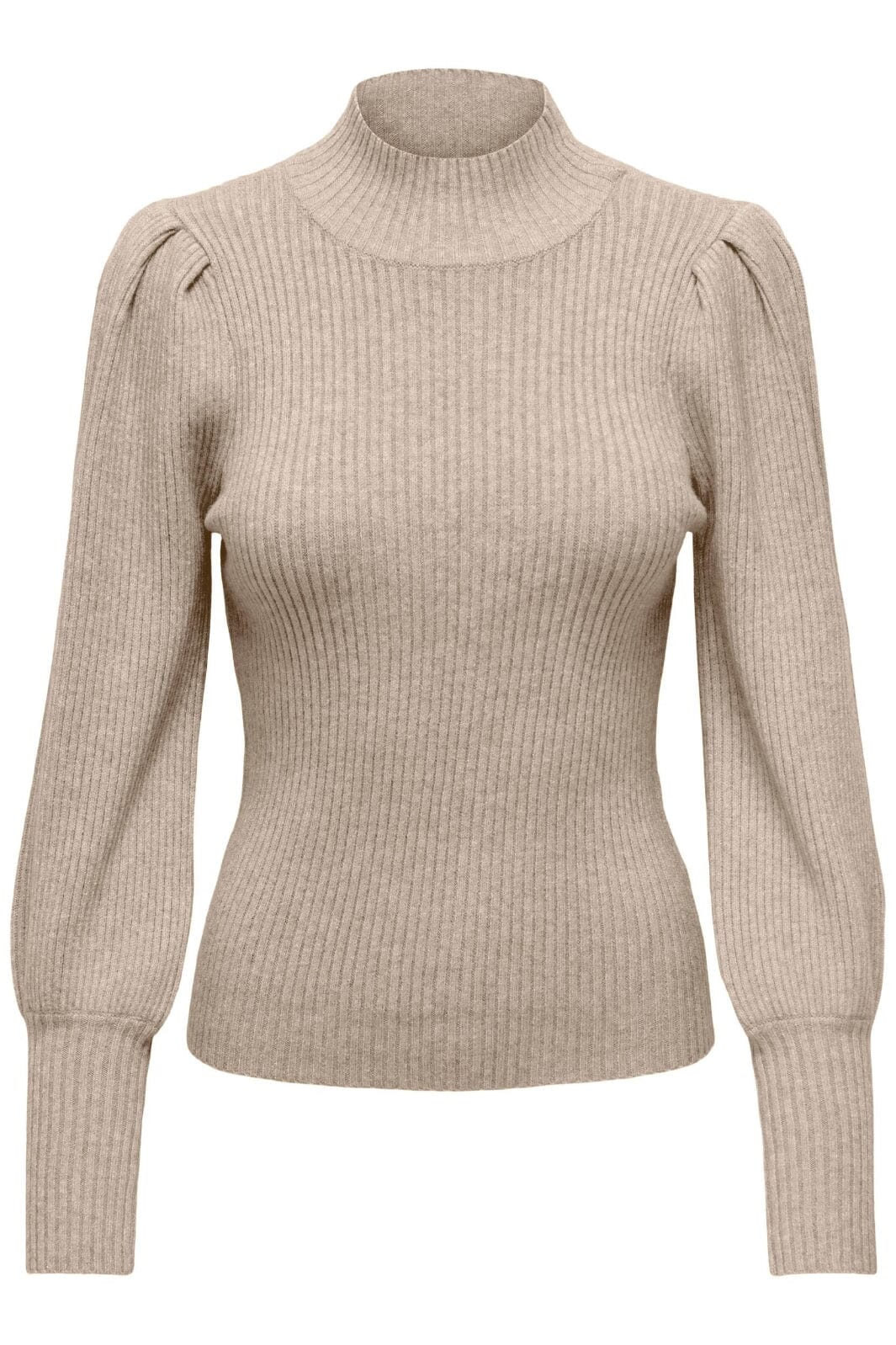 Ribgebreide pullover van Only in beige melange. De trui heeft een hoge hals en lange mouwen met puff-effect, wat zorgt voor een zachte en comfortabele pasvorm.