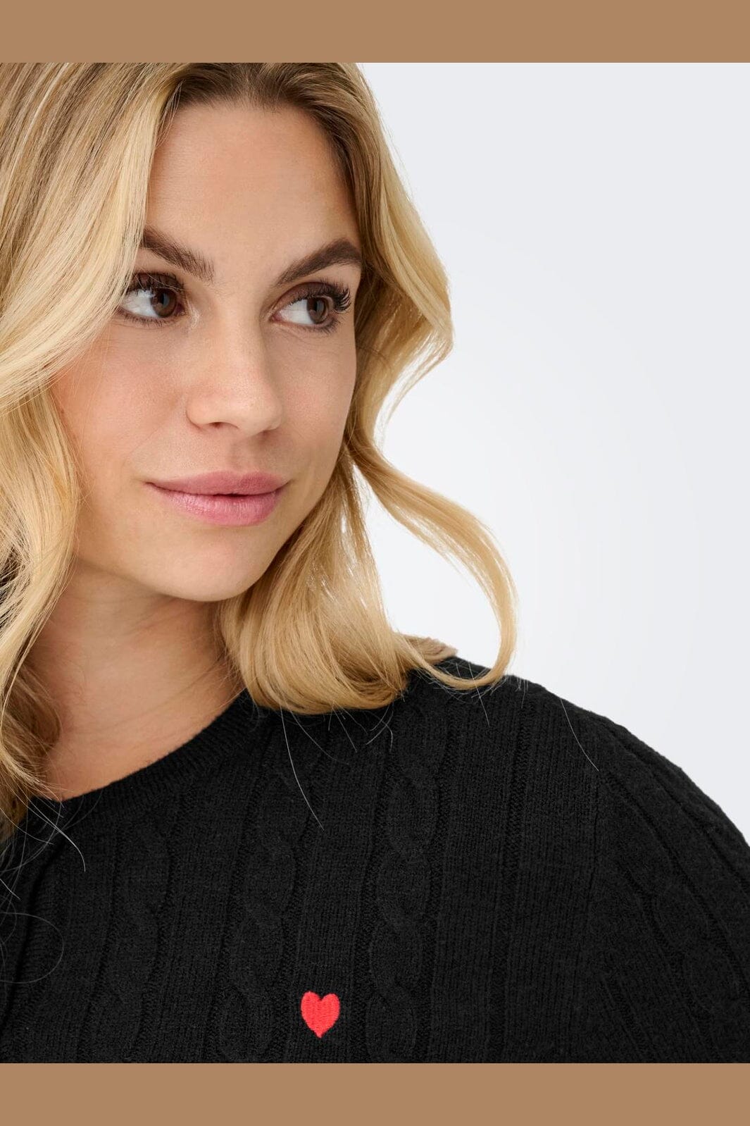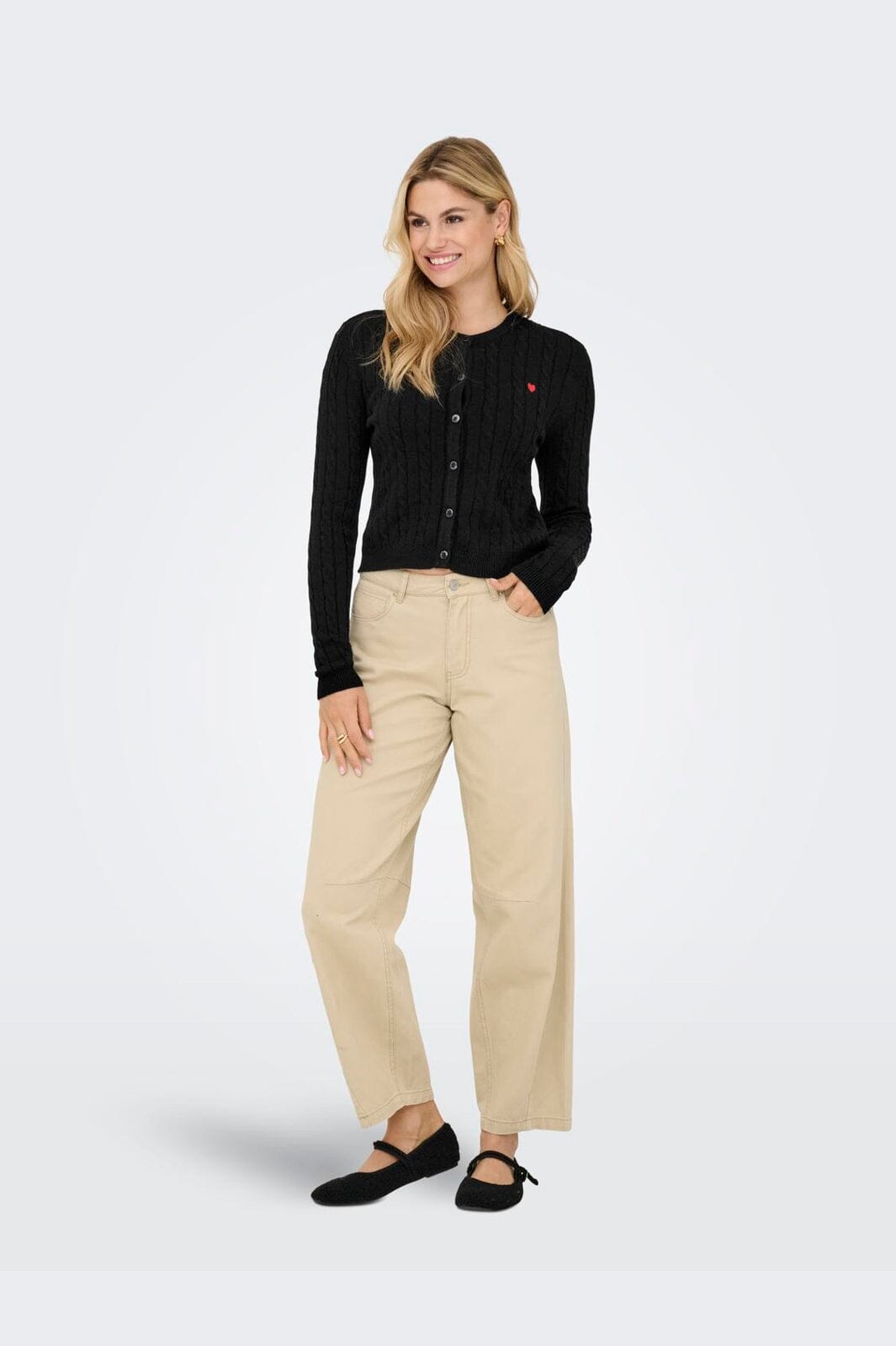 Zwarte kabelgebreide cardigan van Only met knoopsluiting en klein rood hartborduursel op de linkerborst.