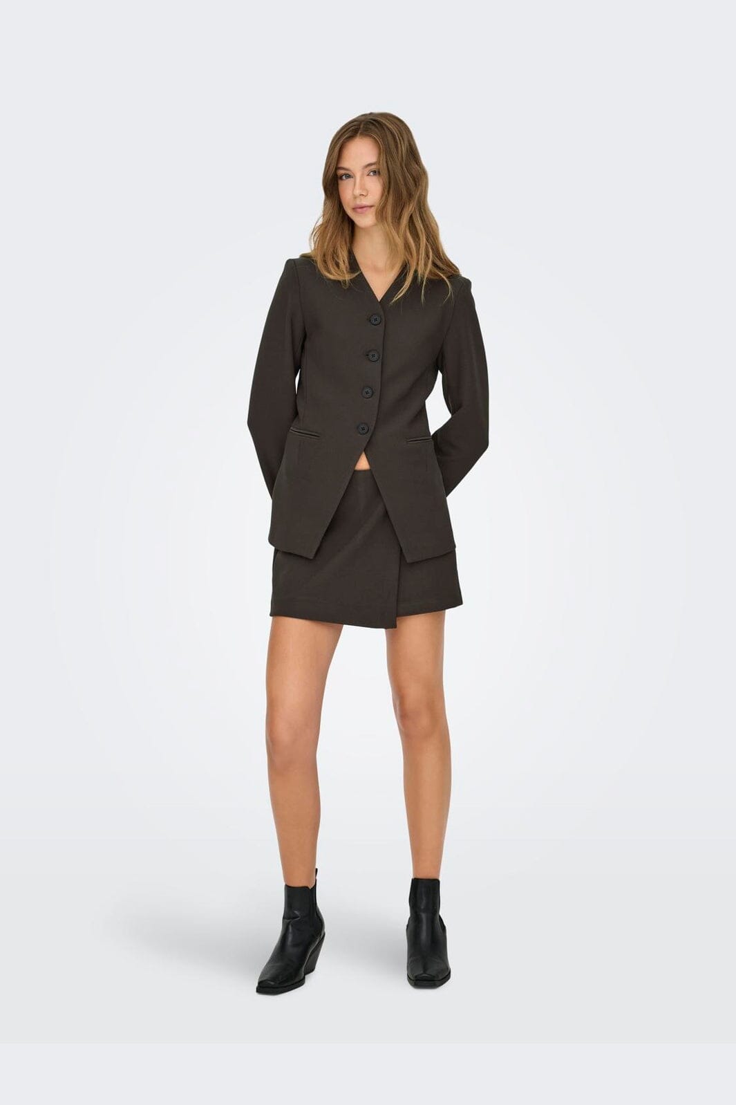 Donkerbruine skort van Only met asymmetrische overslag aan de voorkant. De skort heeft een middelhoge taille en een dijlange lengte.