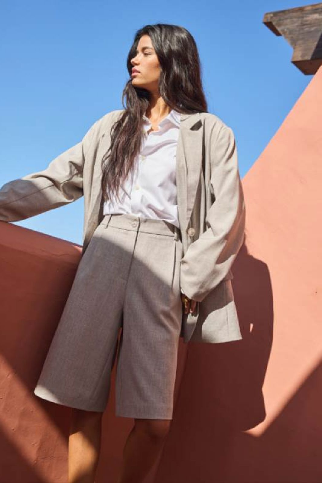 Knielange bermudashorts in lichtgrijs melange met hoge taille en loose fit. De shorts hebben plooien aan de voorkant en praktische zijzakken, evenals riemlussen.