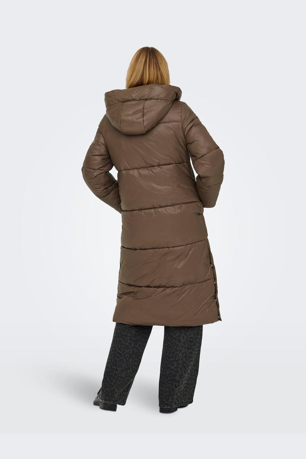 Lange pufferjack van Only in bruine kleur. De jas is gemaakt van 100 % nylon en heeft een capuchon met trekkoord.