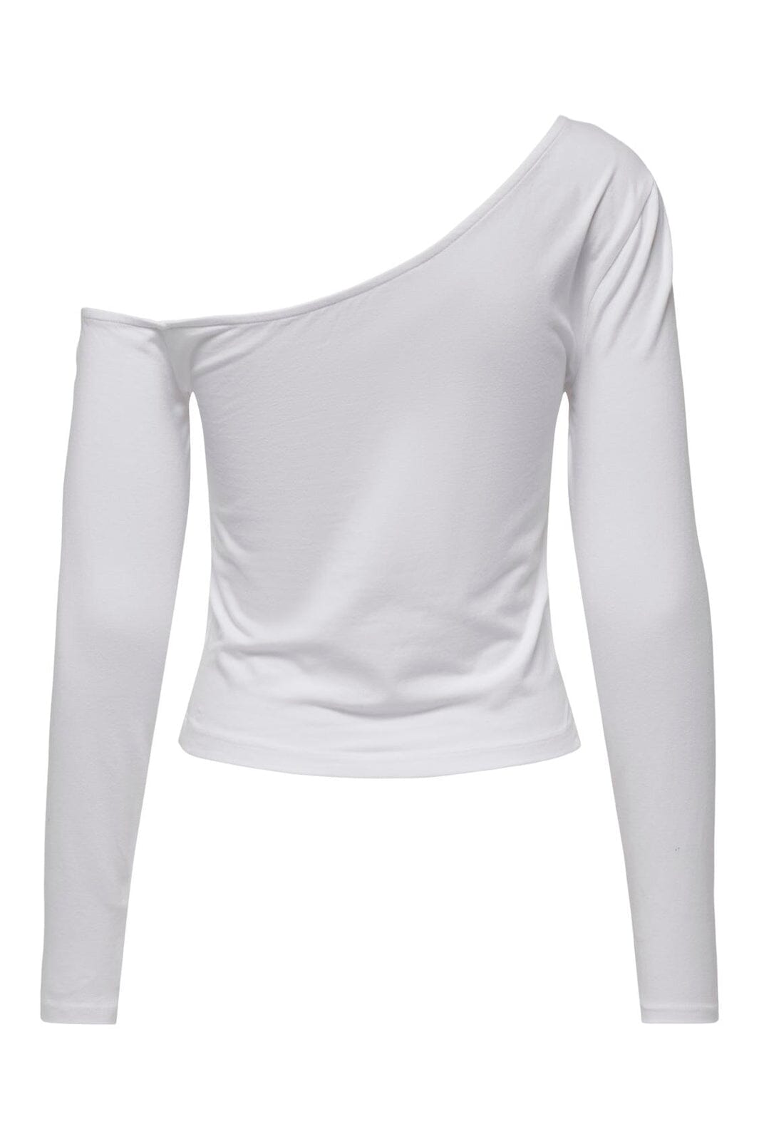 Witte off-shoulder top van Only met lange mouwen. De top heeft een asymmetrisch design met blote schouder en een regular fit-pasvorm, die zorgt voor veel bewegingsvrijheid.
