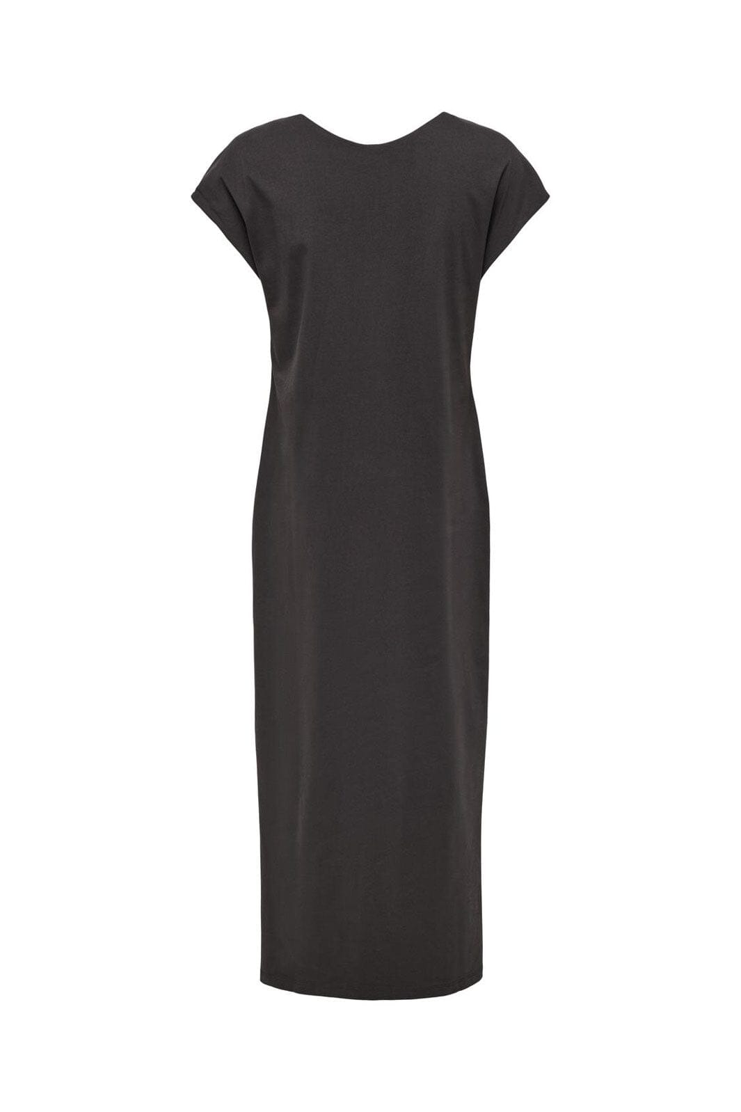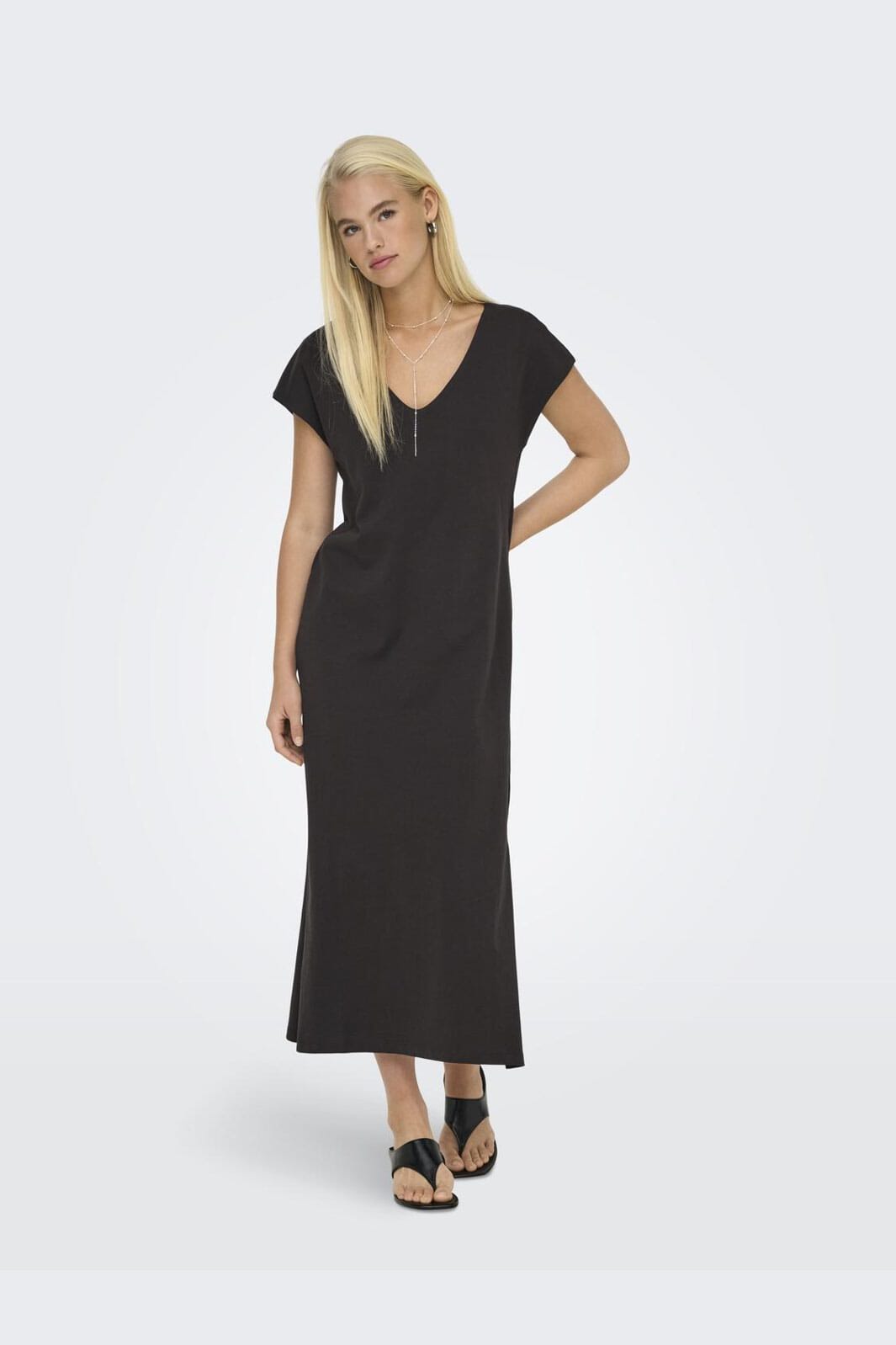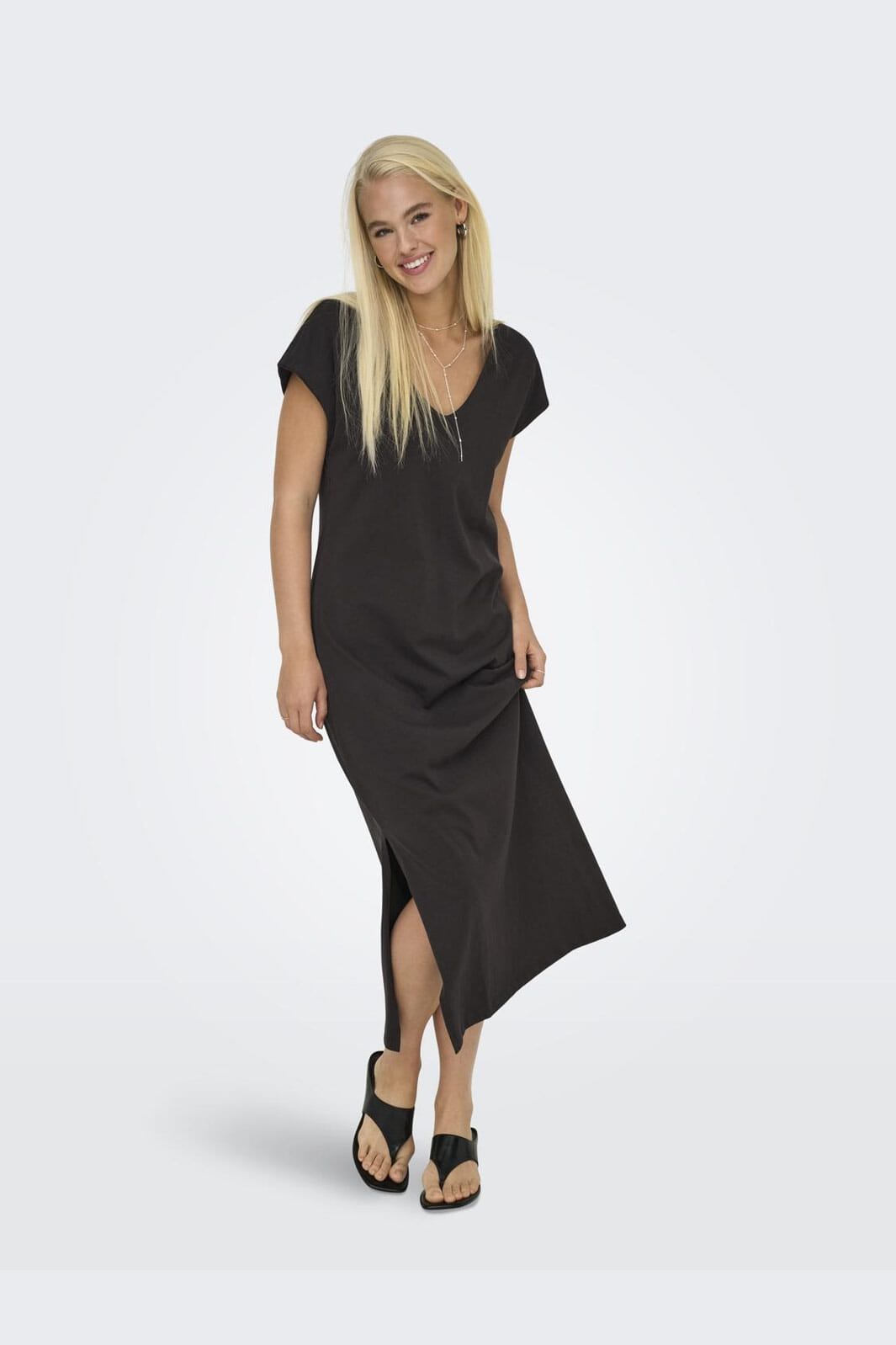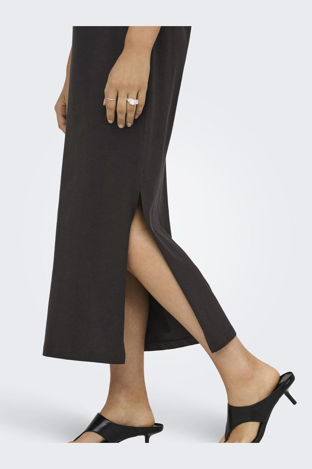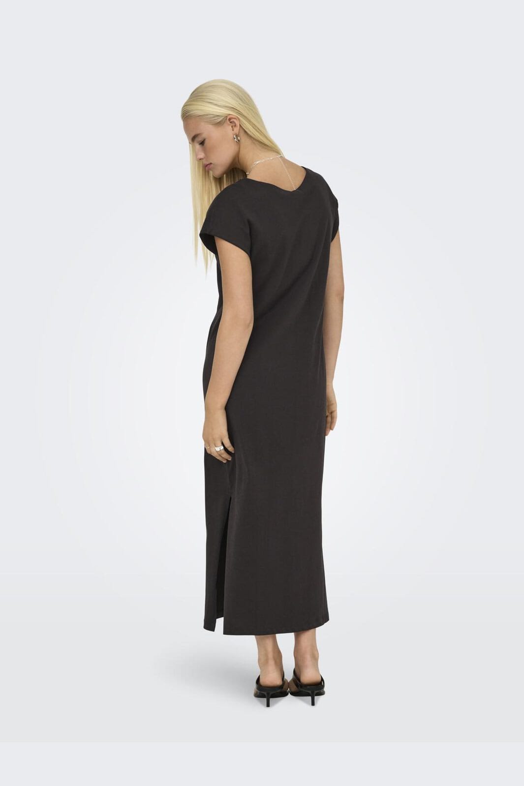 Jurk van Only in een donkerbruine tint. Het heeft een V-hals en korte mouwen met een rechte pasvorm die tot aan de enkels reikt. De zijsplitten bieden goede bewegingsvrijheid.