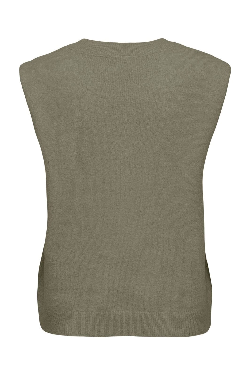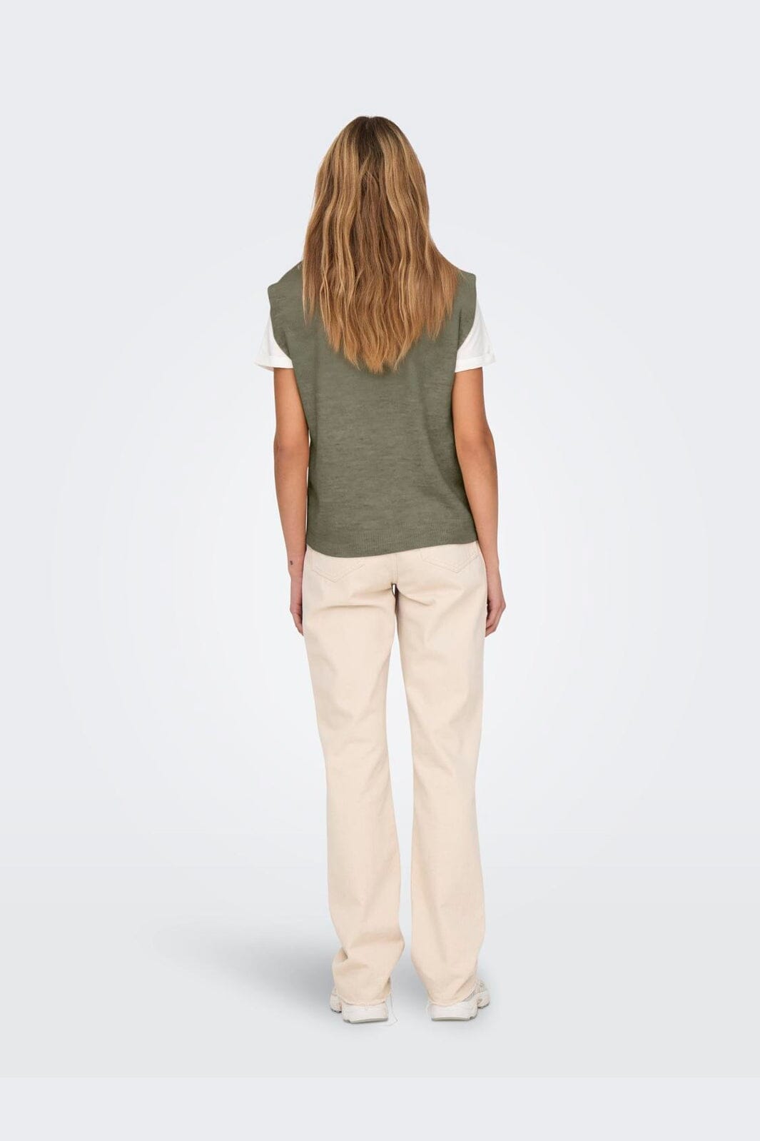 Mouwloos vest van Only in kaki-groene kleur met geborduurde gouden hartjes verspreid over de stof. Het vest heeft een ronde halslijn en ribboorden.