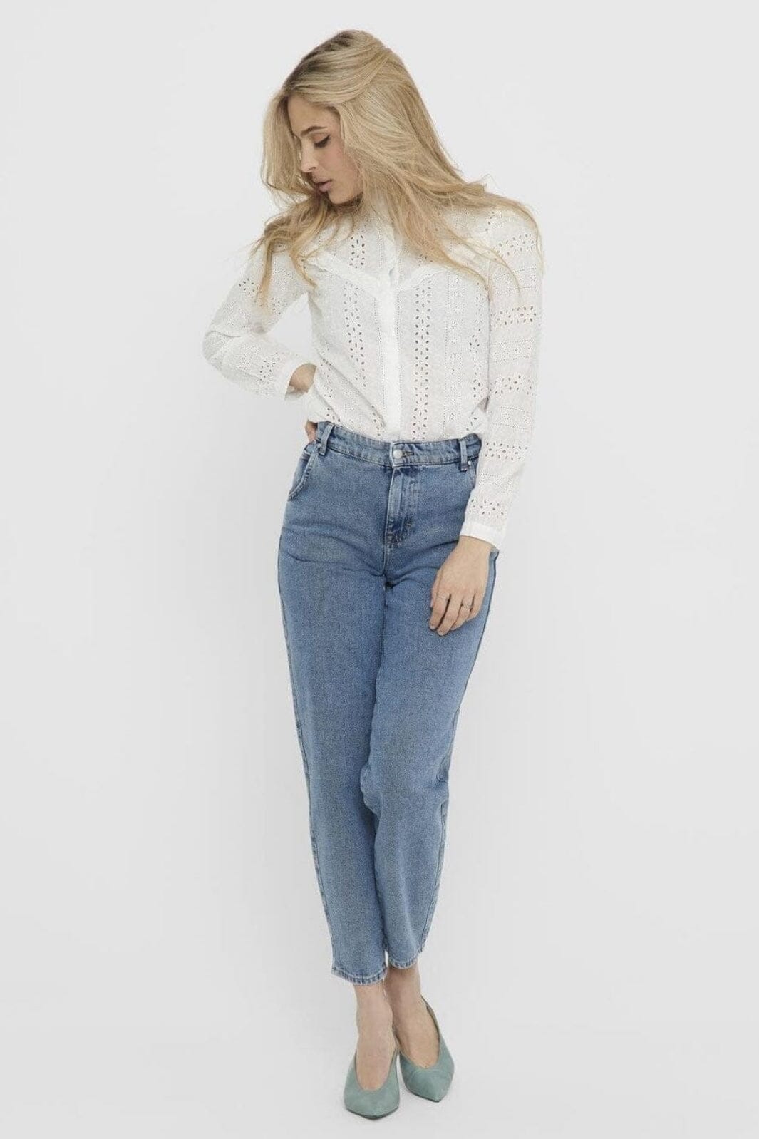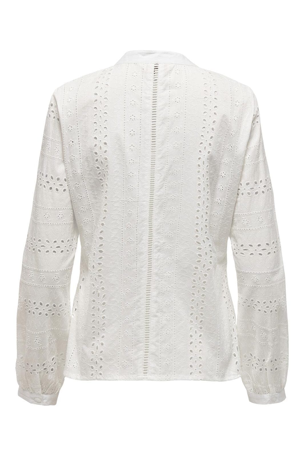 Witte blouse van Only met broderie anglaise-patroon. De blouse heeft een overhemdkraag met knoopsluiting en lange mouwen met manchetten.