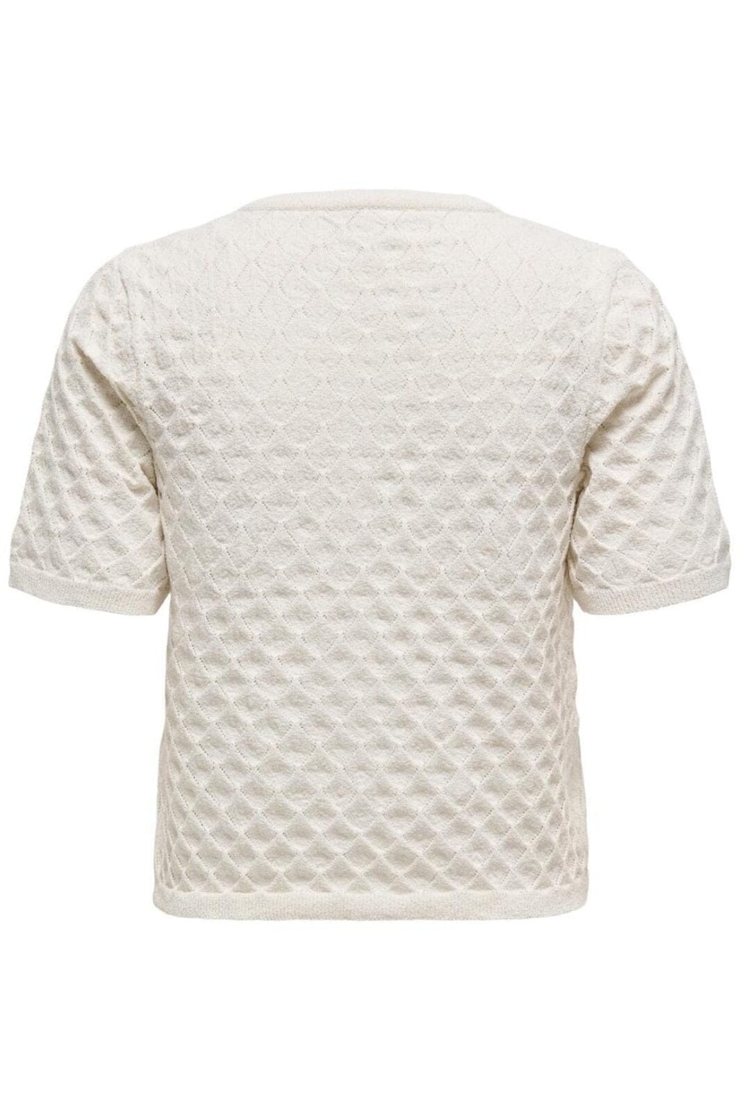 Korte mouw cardigan van Only in een lichte crème witte tint. Gebreid met een gestructureerd oppervlak en ronde halslijn. Sluit met parelknopen aan de voorkant.