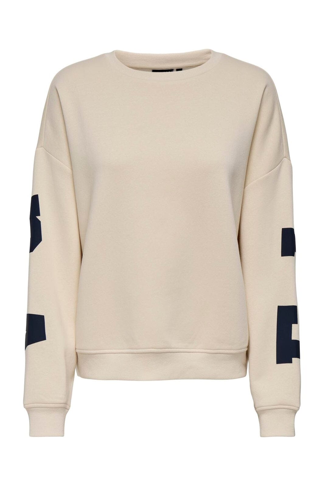 Sweatshirt van Only in een lichtbeige tint met donkerblauwe print op de mouwen en de achterkant. De sweatshirt heeft een ronde hals en lange mouwen.