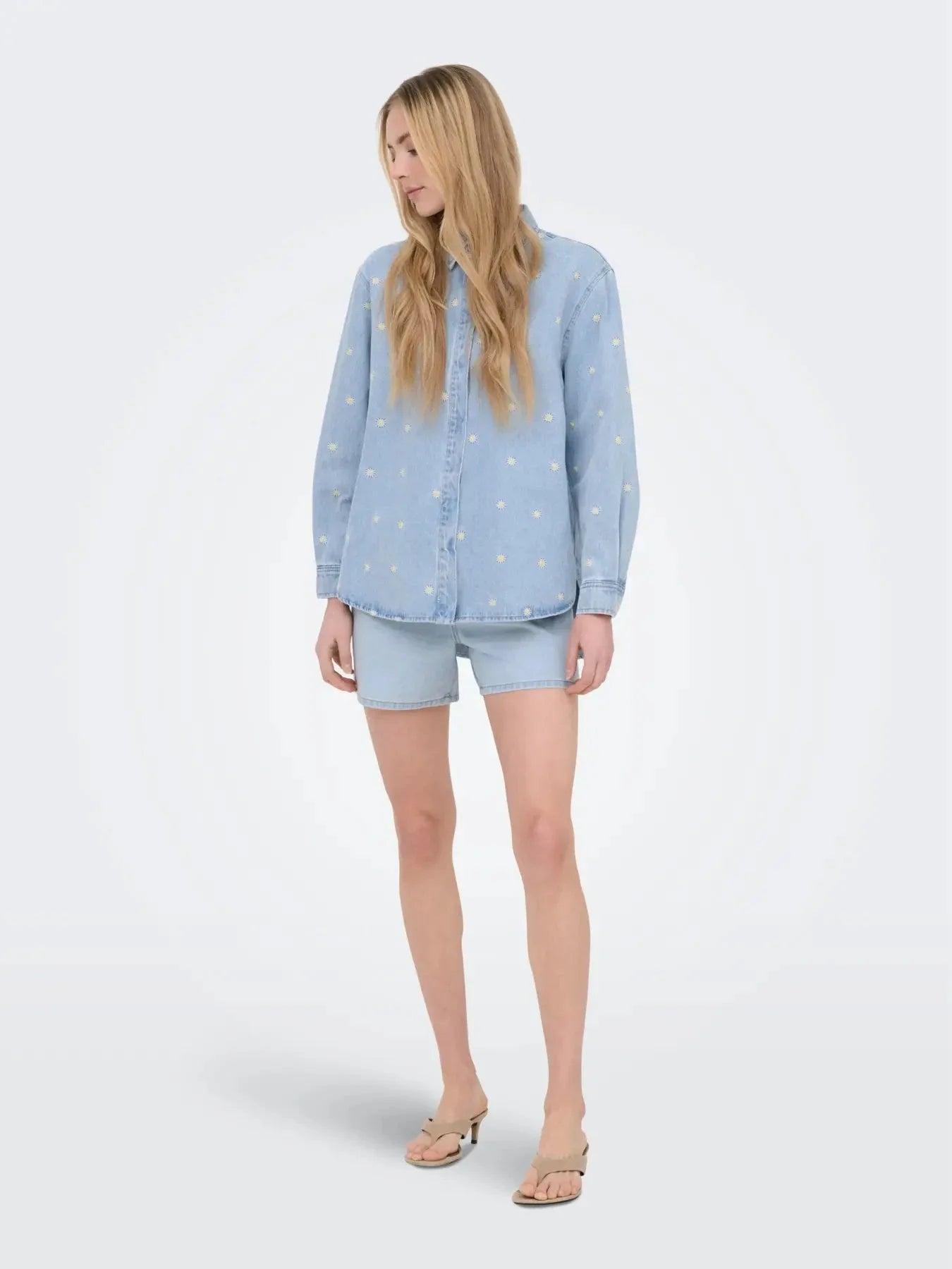 Denimoverhemd van Only in middelblauwe denim met kleine madeliefjesborduursels verspreid over de stof. Het overhemd heeft een klassieke kraag en een afgeronde zoom.