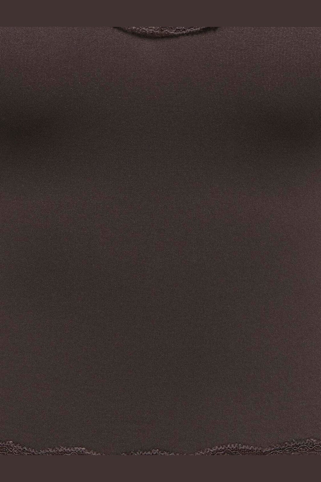 Bruine cropped top van Only met kanten randjes. De top heeft een V-hals en is gemaakt van een zacht, rekbaar materiaal met fijne kanten details langs de randen.