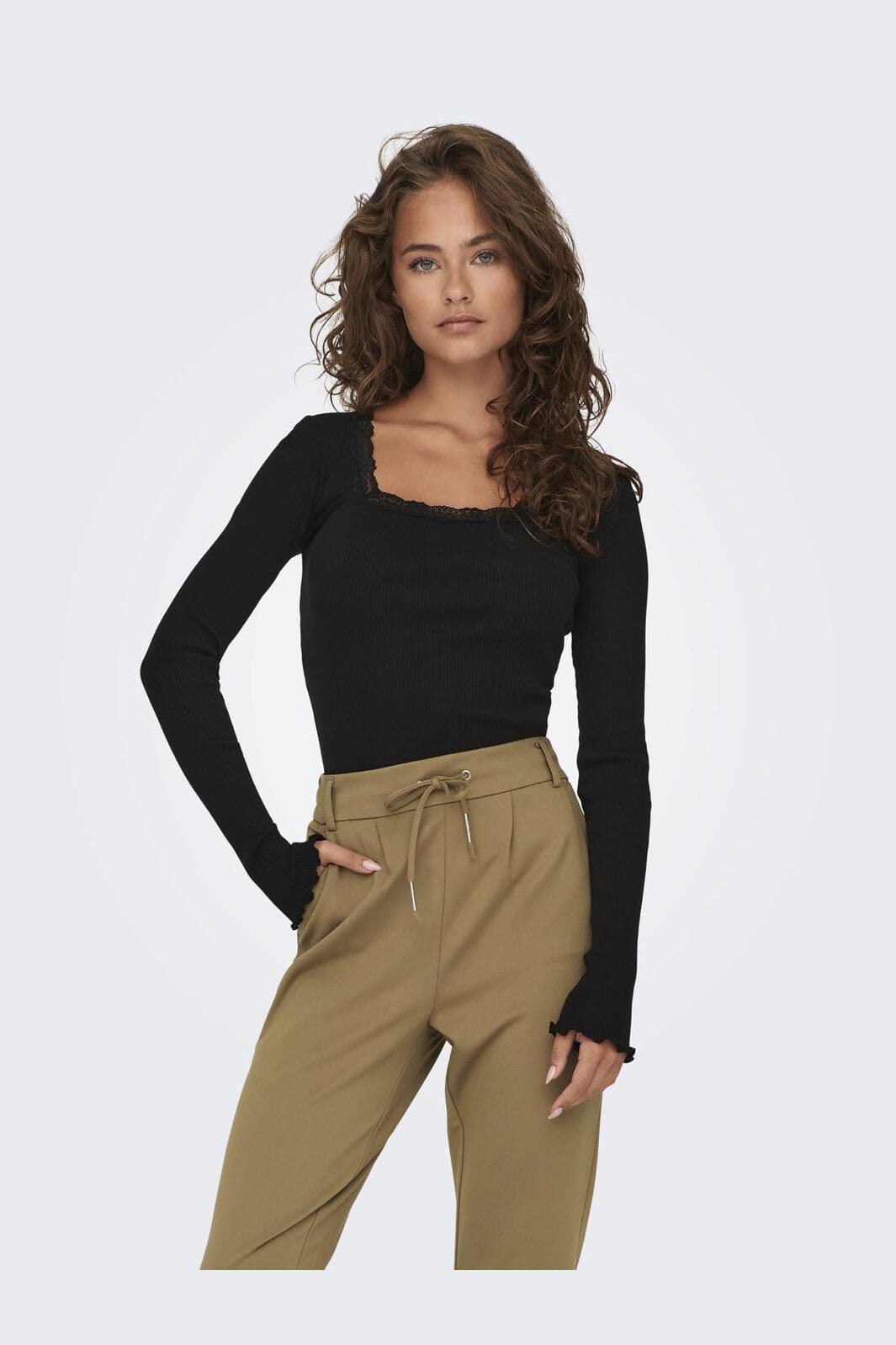 Zwarte top van Only met kantdetails. De top heeft een vierkante halslijn met kantafwerking en lange mouwen met golvende afwerking.