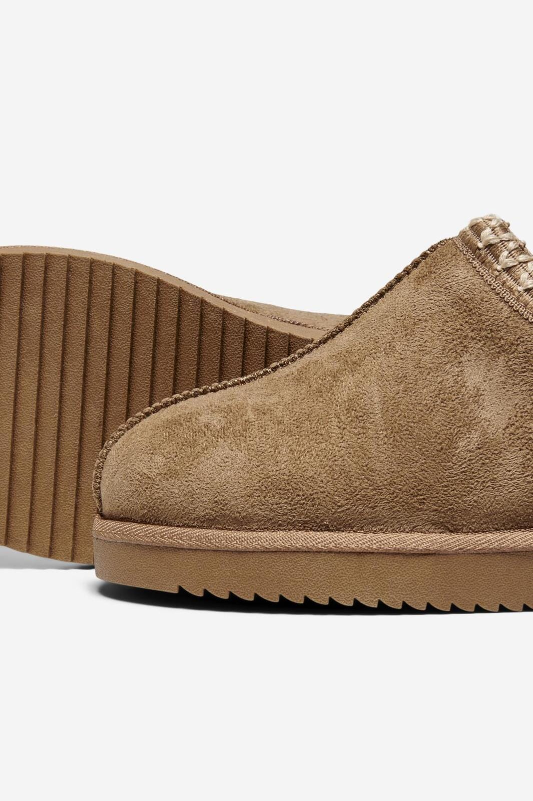 Huisschoenen van Only in cognackleurig synthetisch suède. De zachte schoen heeft een warme teddyvoering en decoratieve stiksels langs de rand.