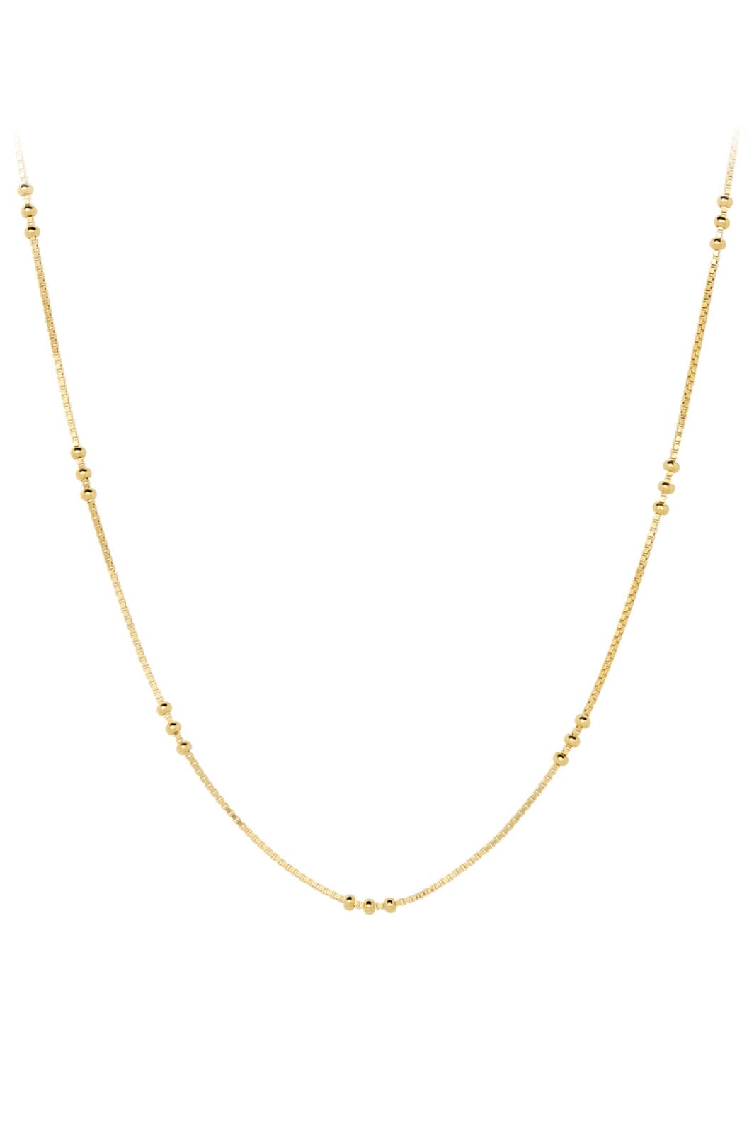 Gouden halsketting van Pernille Corydon Jewellery met een fijne afwisseling van kleine parels en platte secties langs de ketting. Het sieraad is gemaakt van verguld sterling zilver.
