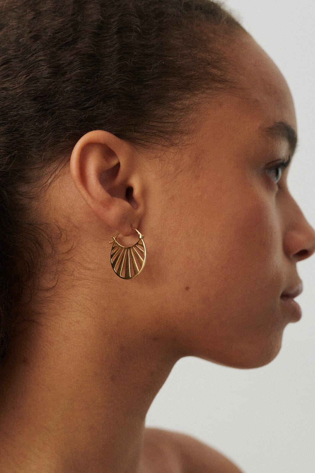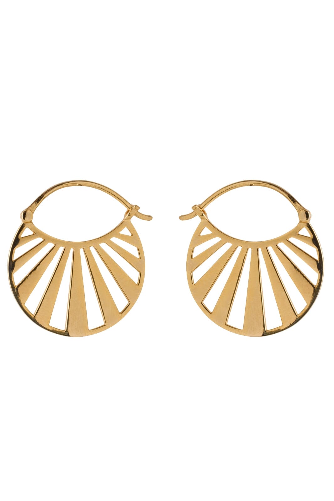 Gouden oorbellen van Pernille Corydon Jewellery met een cirkelvorm en zonnestraalmotief. Het sieraad is handgemaakt van verguld sterling zilver met fijne straaldetails.