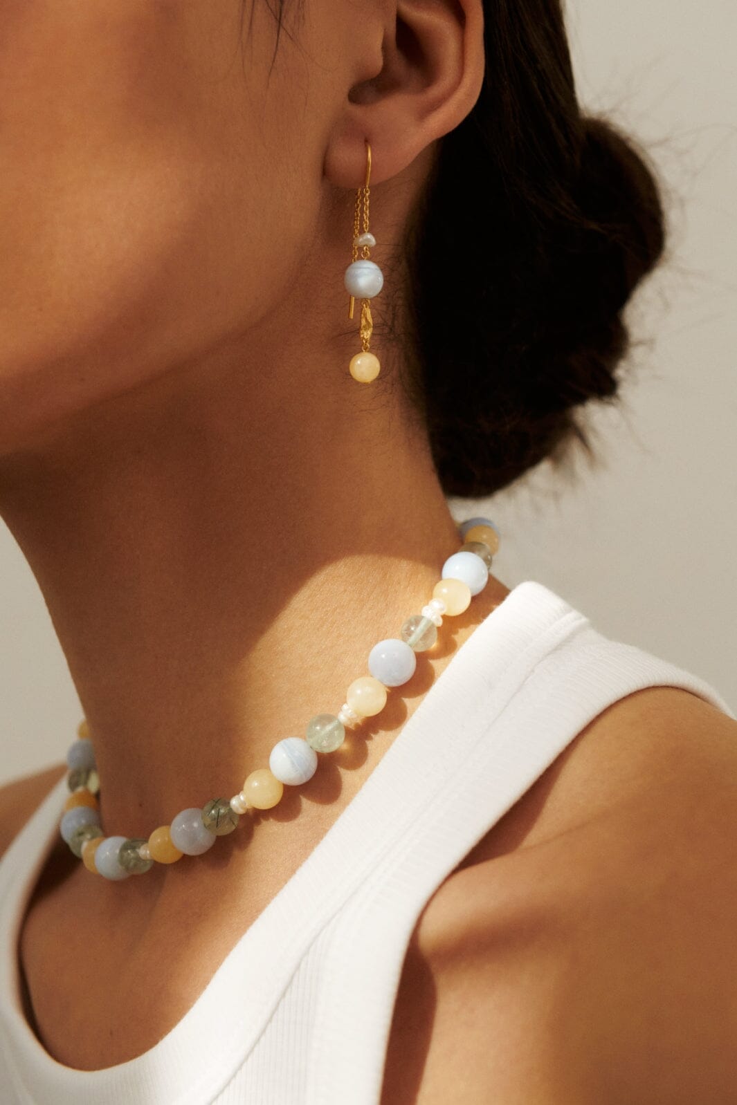 Oorbellen van Pernille Corydon met parels in blauwe en gouden pastelkleuren. De sieraden hebben een verticale vorm met zoetwaterparels en zijn gemaakt van gecertificeerd gerecycled zilver met een gouden coating.