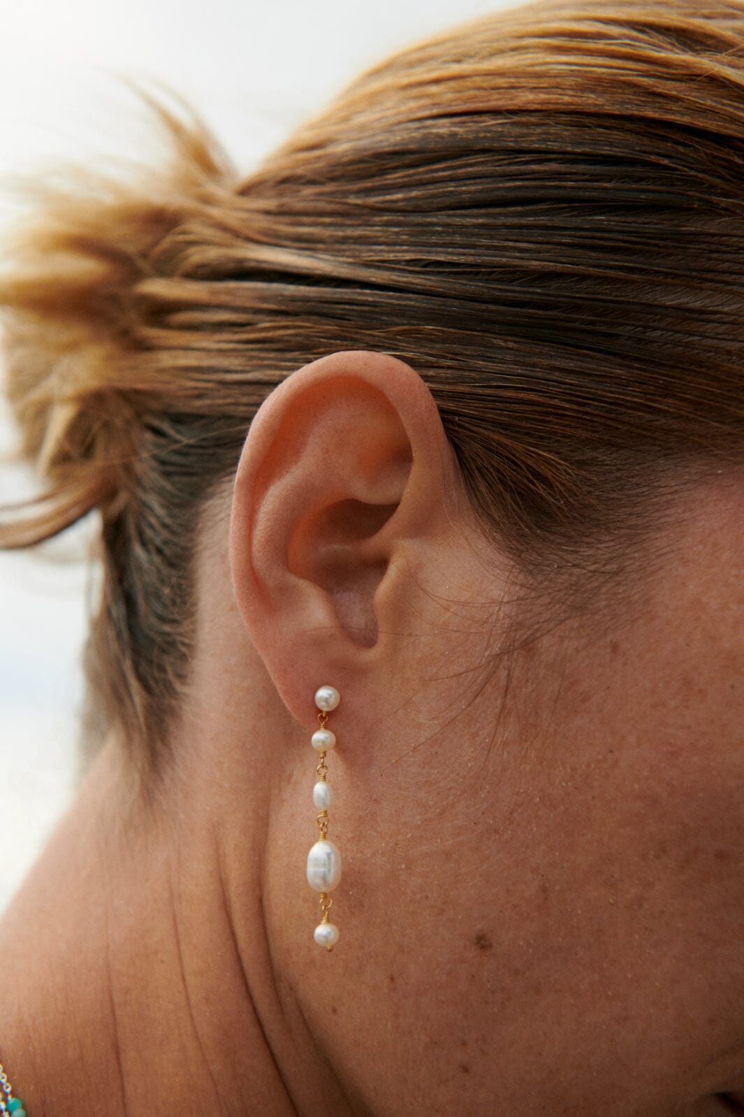 Oorbellen van Pernille Corydon met witte parels in verschillende maten. De hangende parels zijn samengevoegd met goudkleurige schakels die een mooie beweging creëren.