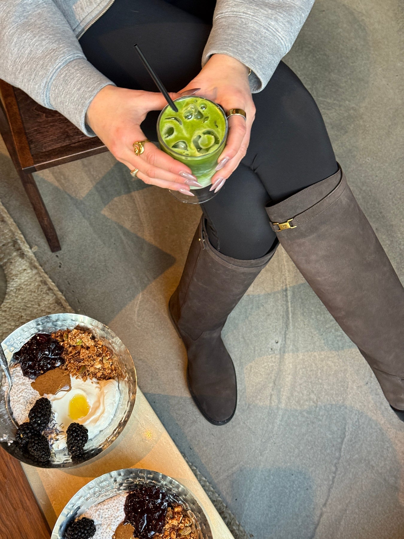 Knielange laarzen van Phenumb Copenhagen, gemaakt van suède in een donkerbruine tint. De laarzen hebben een platte zwarte zool en een kleine goudkleurige gesp aan de bovenkant.