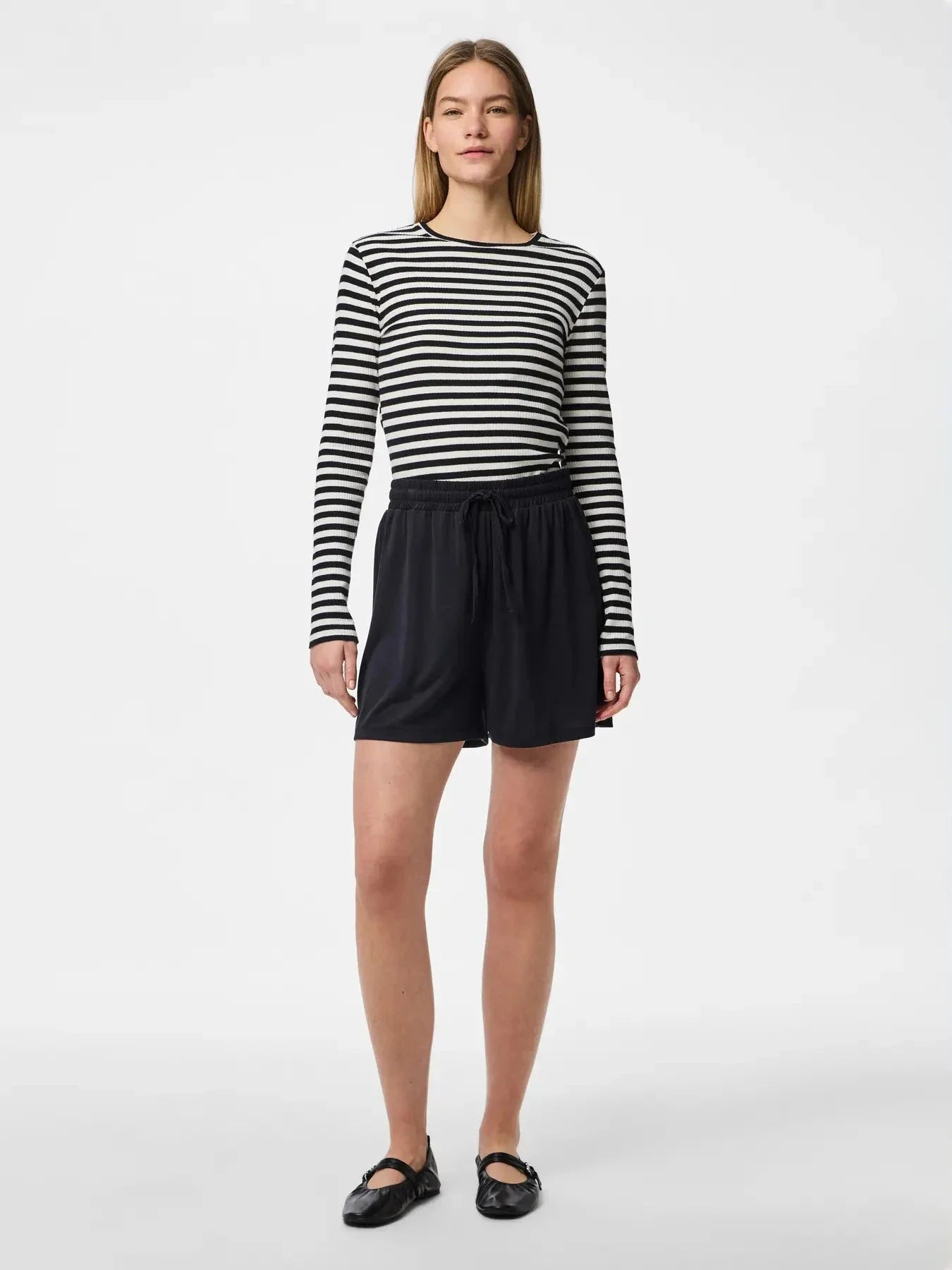 Zwarte shorts van Pieces met hoge taille en vetersluiting. De shorts hebben een regular fit en zijn ontworpen voor zowel thuisgebruik als casual activiteiten.
