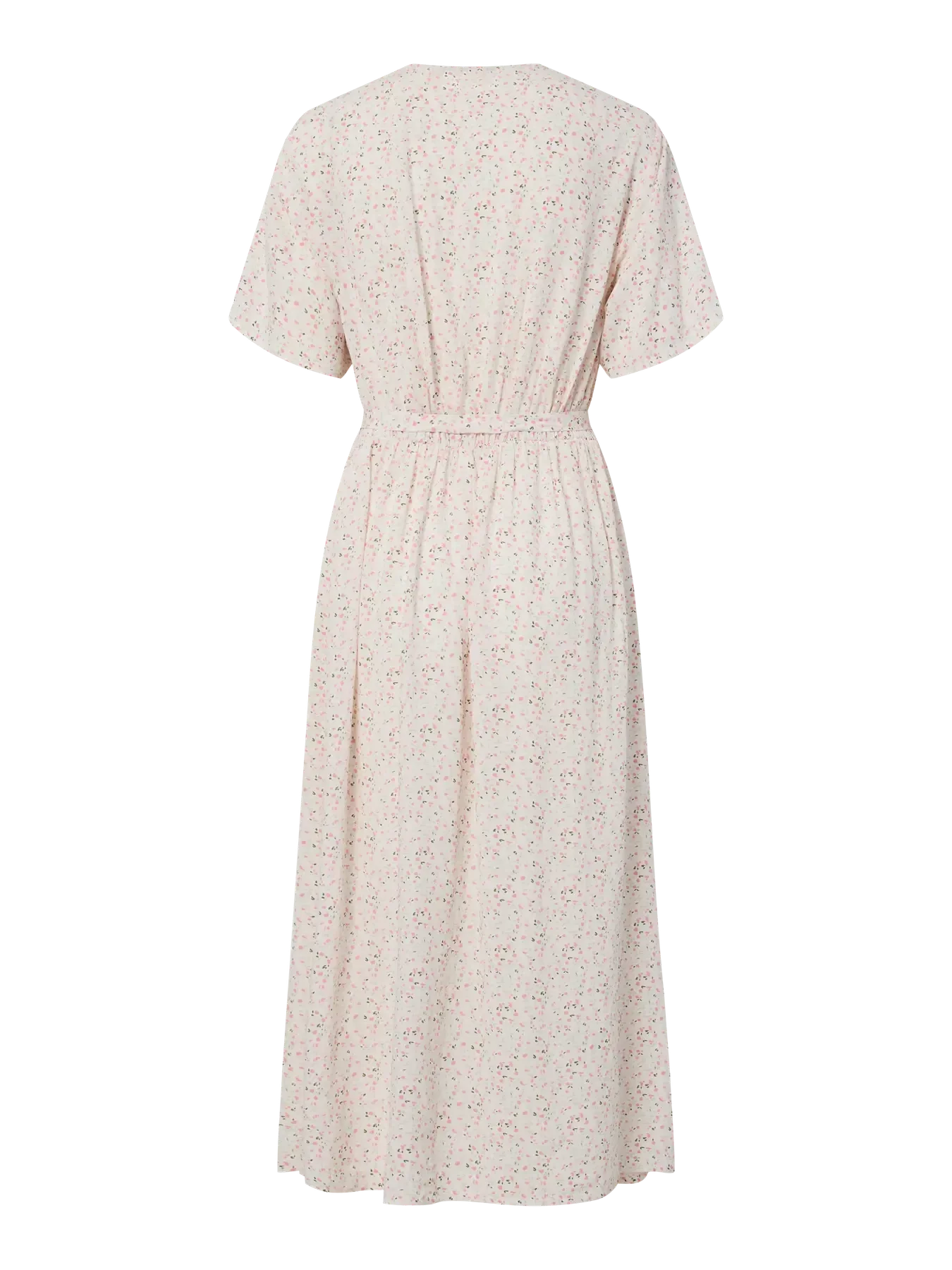 Midi-jurk van Pieces met V-hals en fijn bloemmotief in crème en wit. De jurk heeft korte mouwen en een strikceintuur in de taille.